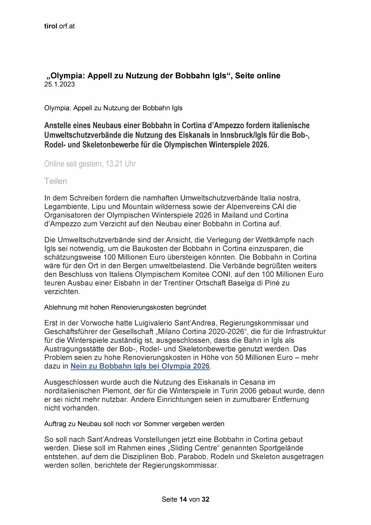 „Olympia: Appell zu Nutzung der Bobbahn Igls“, Seite online
