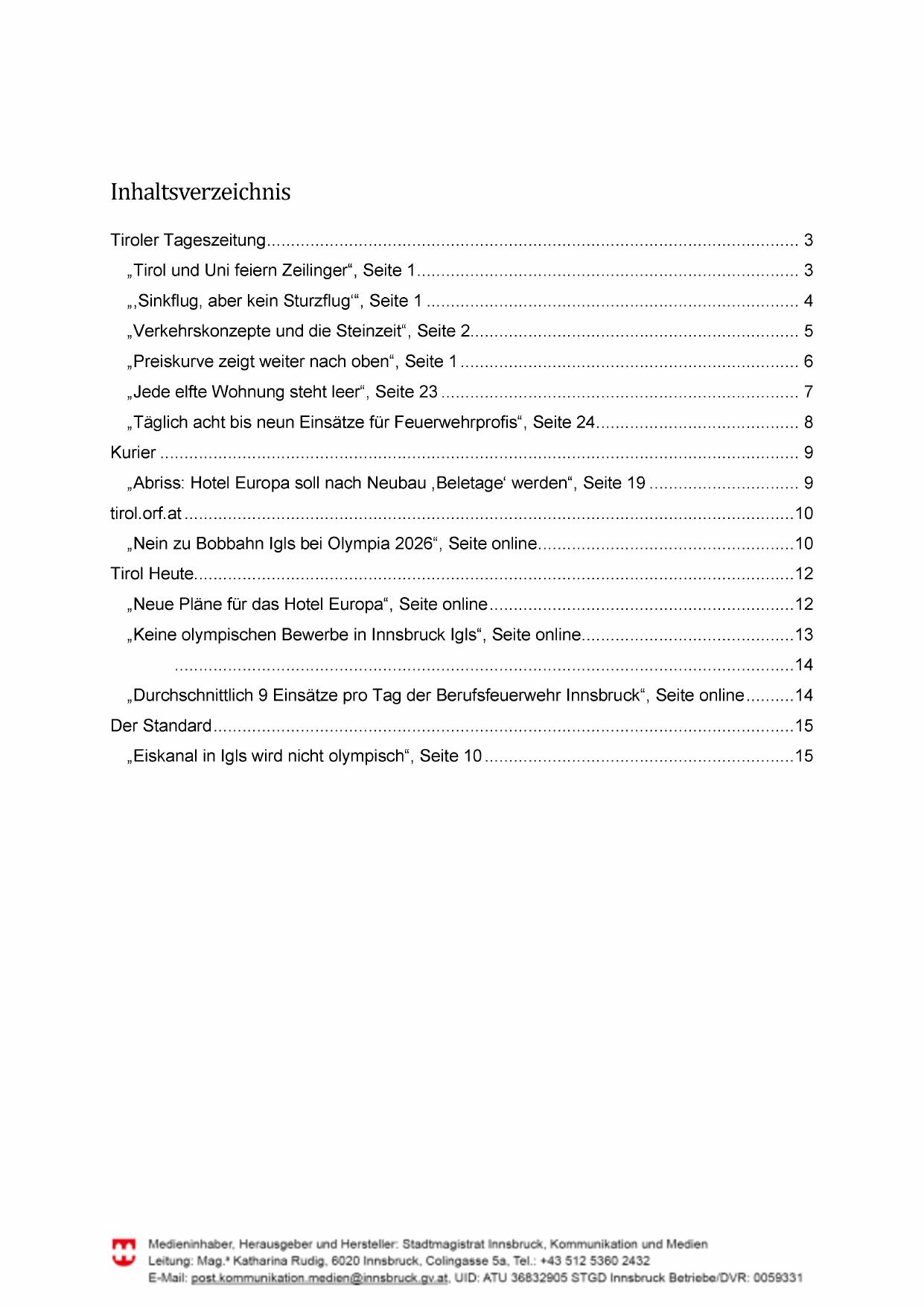 „Durchschnittlich 9 Einsätze pro Tag der Berufsfeuerwehr Innsbruck“, Seite online.......... 14