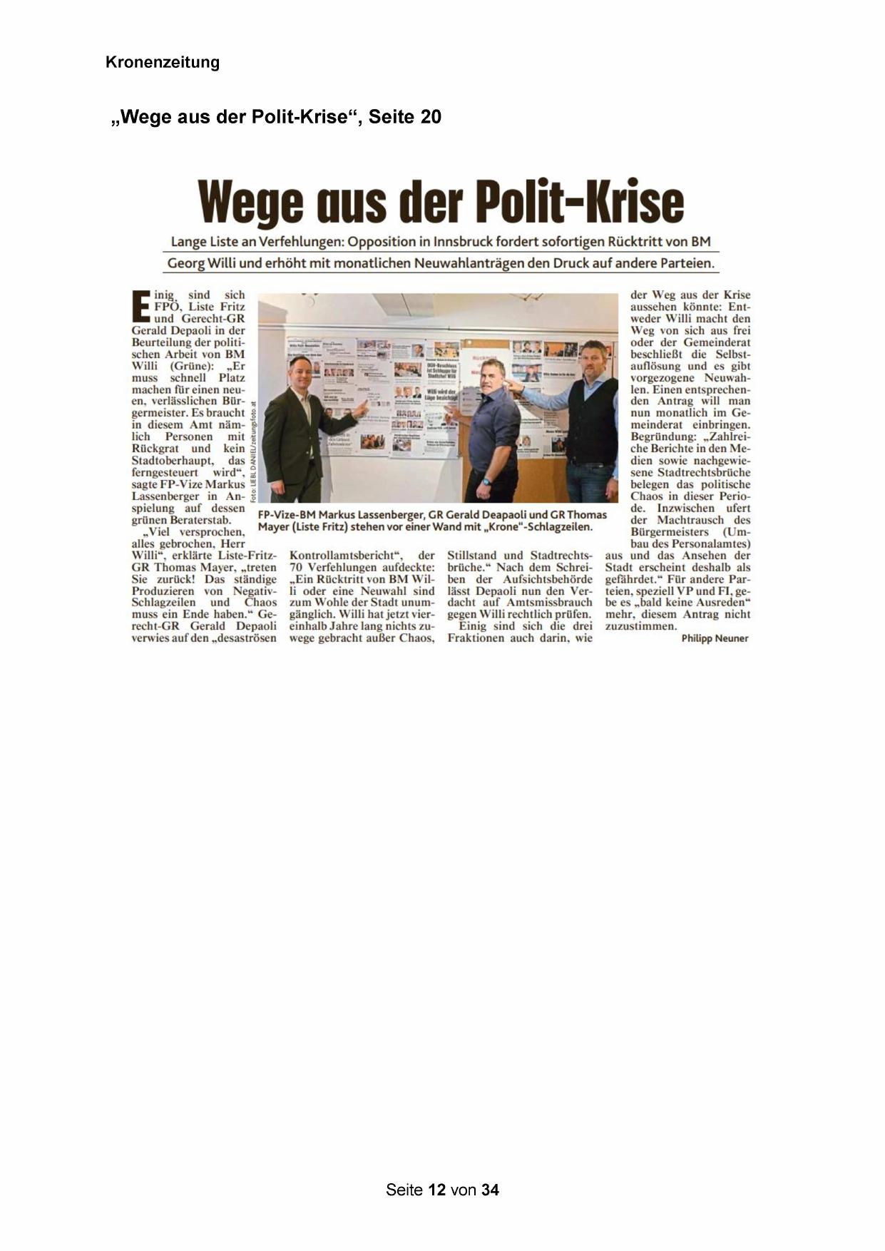 Mayer (Liste Fritz) stehen vor einer Wand mit „Krone“-Schlagzeilen.