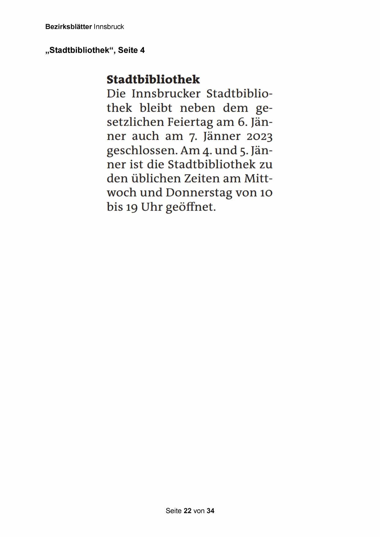 Die Innsbrucker Stadtbibliothek bleibt neben dem gesetzlichen Feiertag am 6. Jänner auch am 7. Jänner 2023