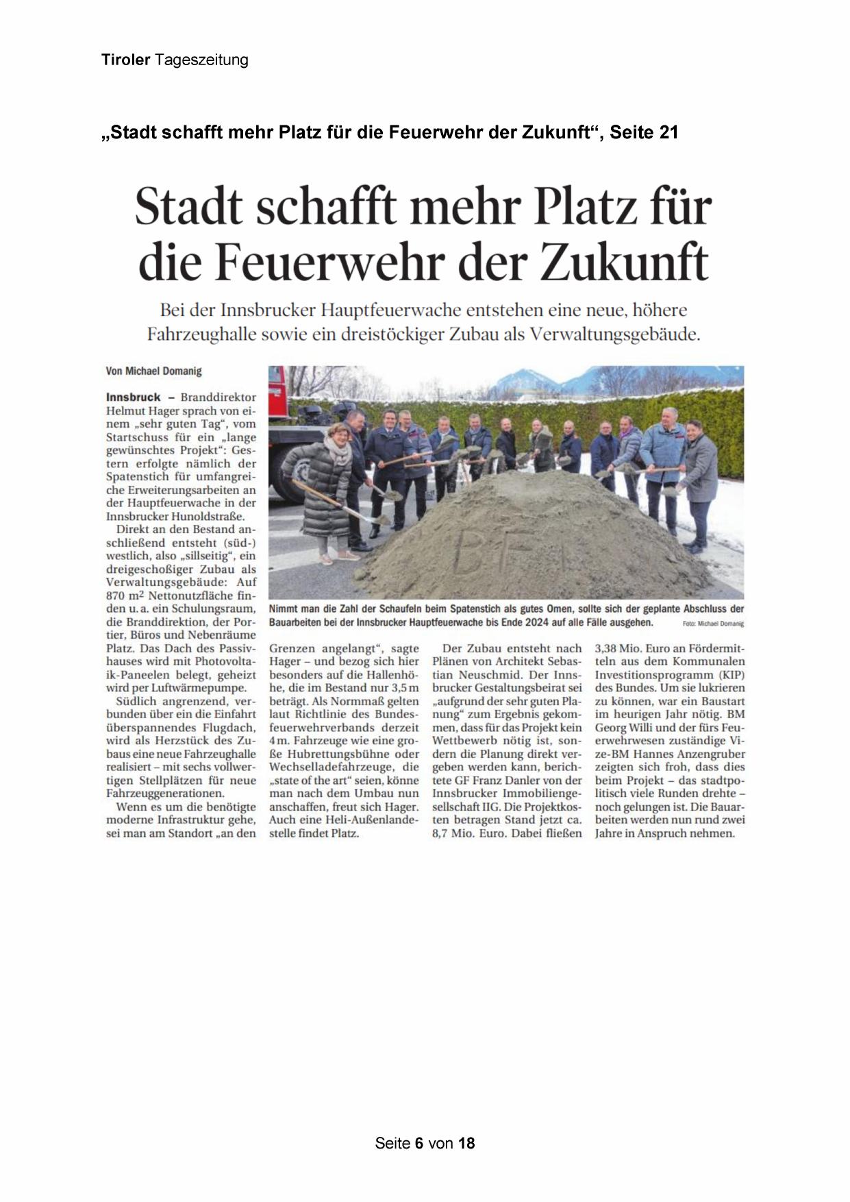 Bauarbeiten bei der Innsbrucker Hauptfeuerwache bis Ende 2024 auf alle Fälle ausgehen.