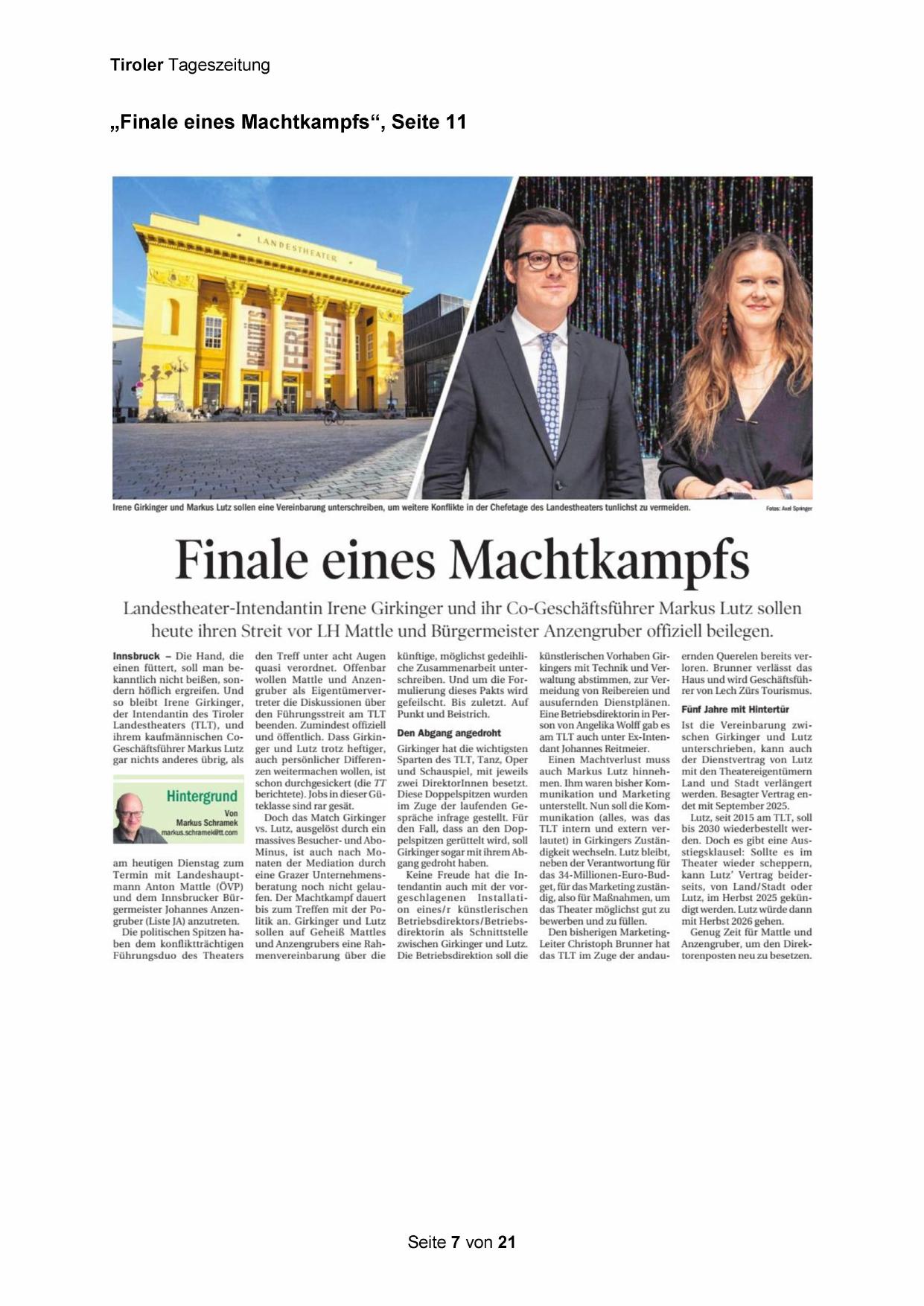TLT intern und extern verlautet) in Girkingers Zuständigkeit wechseln. Lutz bleibt,
