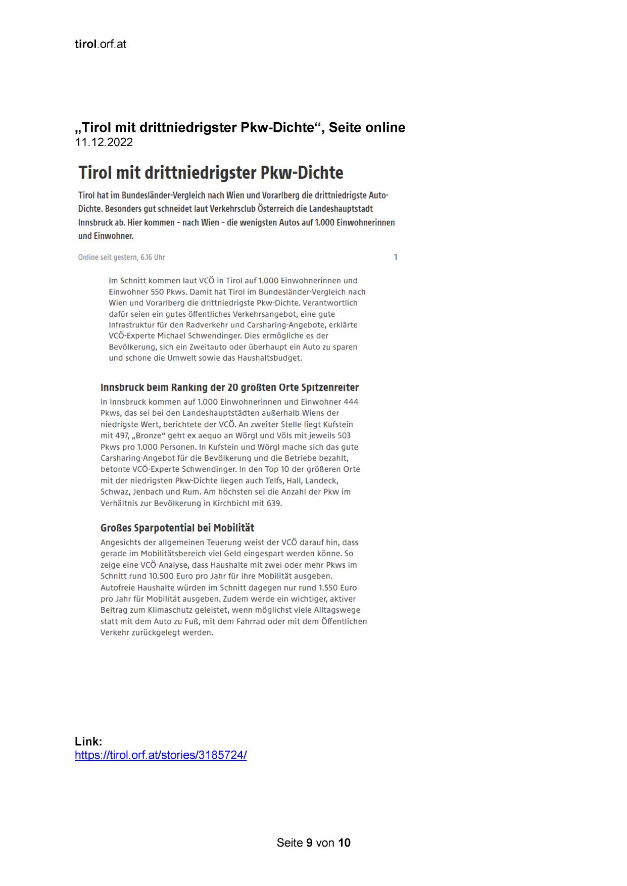 „Tirol mit drittniedrigster Pkw-Dichte“, Seite online