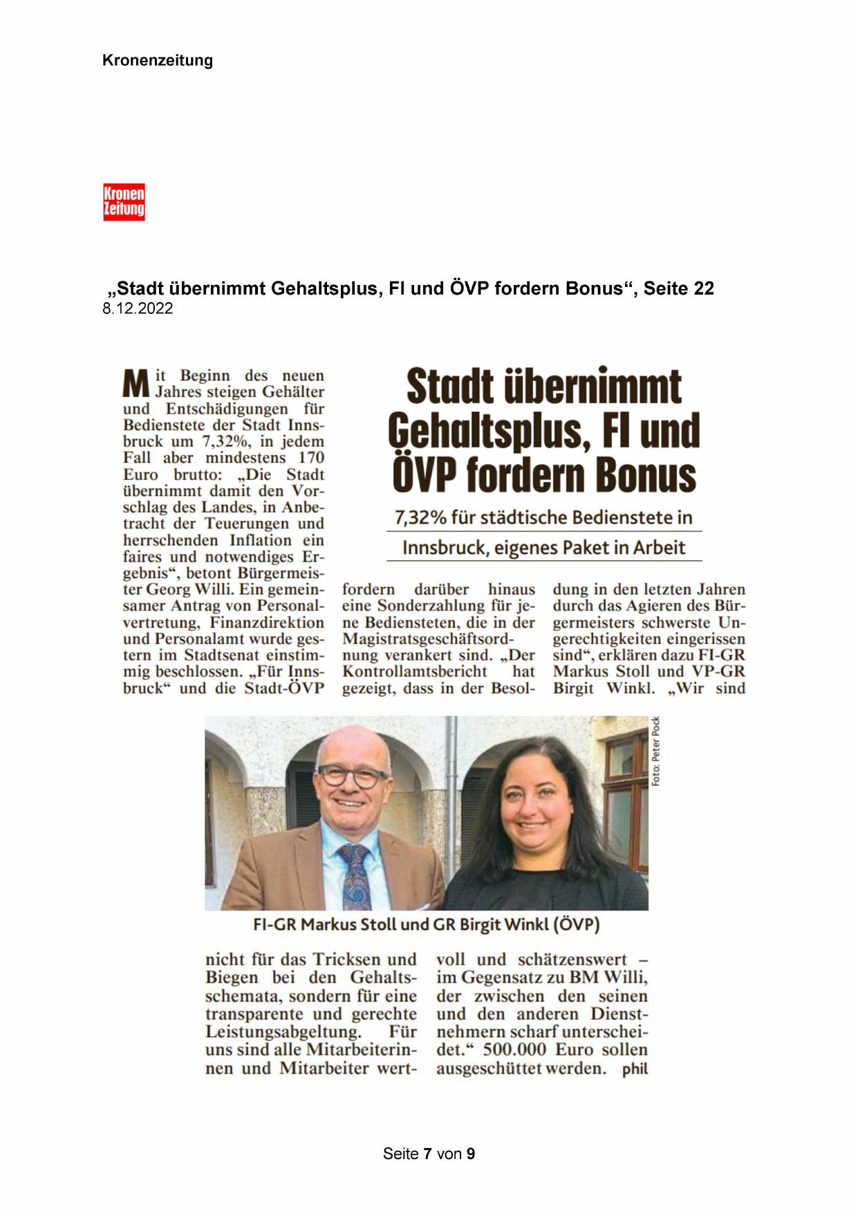 „Stadt übernimmt Gehaltsplus, FI und ÖVP fordern Bonus“, Seite 22