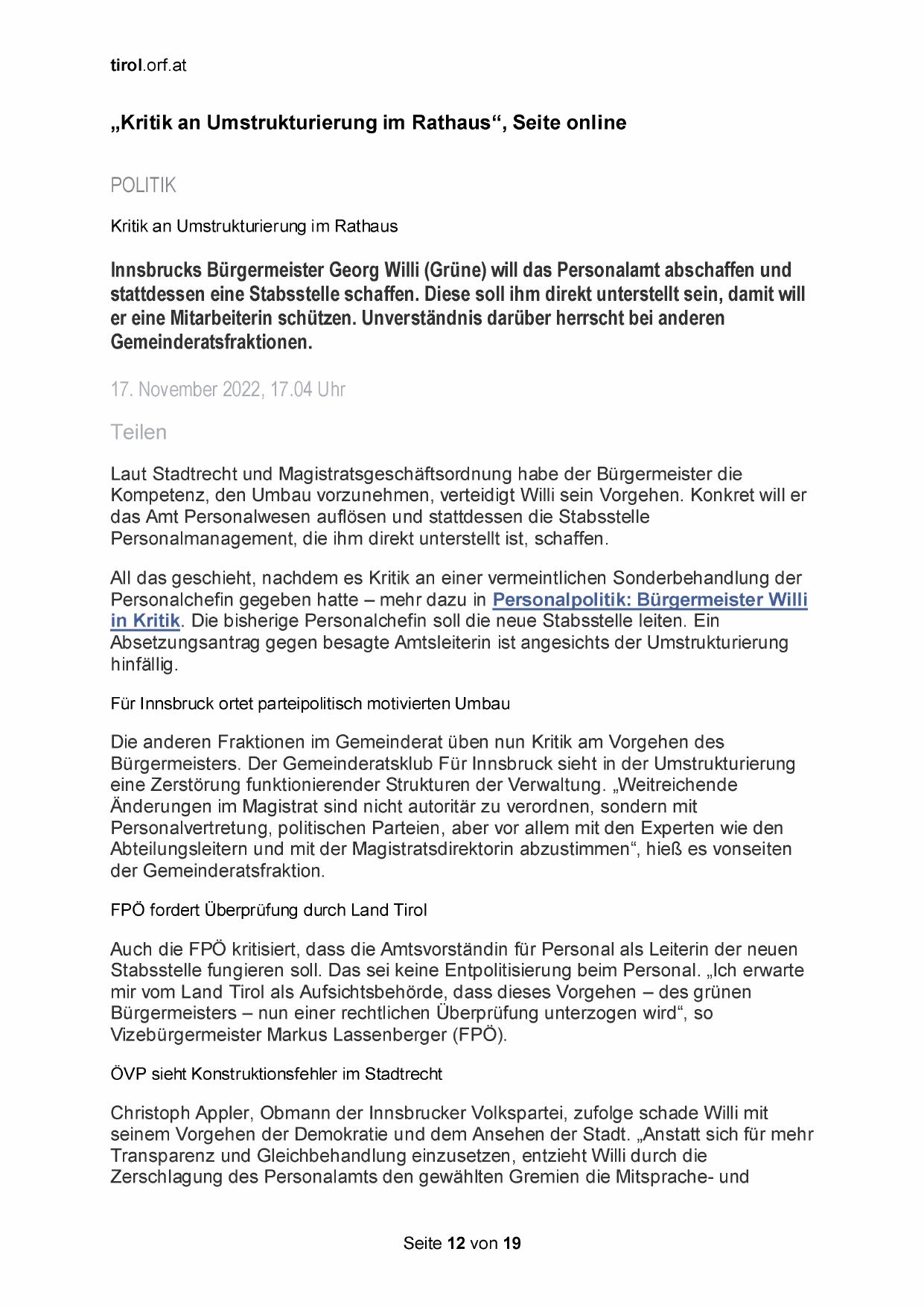 „Kritik an Umstrukturierung im Rathaus“, Seite online