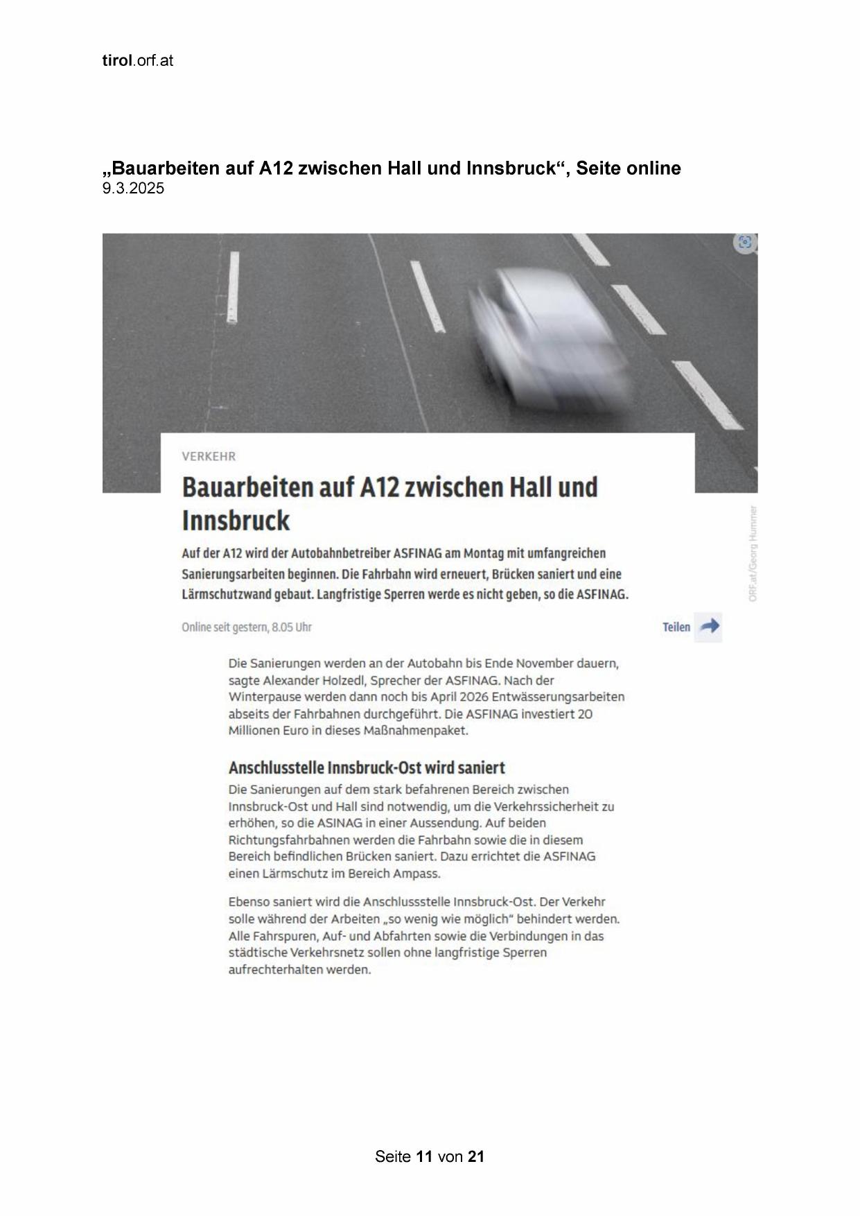 „Bauarbeiten auf A12 zwischen Hall und Innsbruck“, Seite online