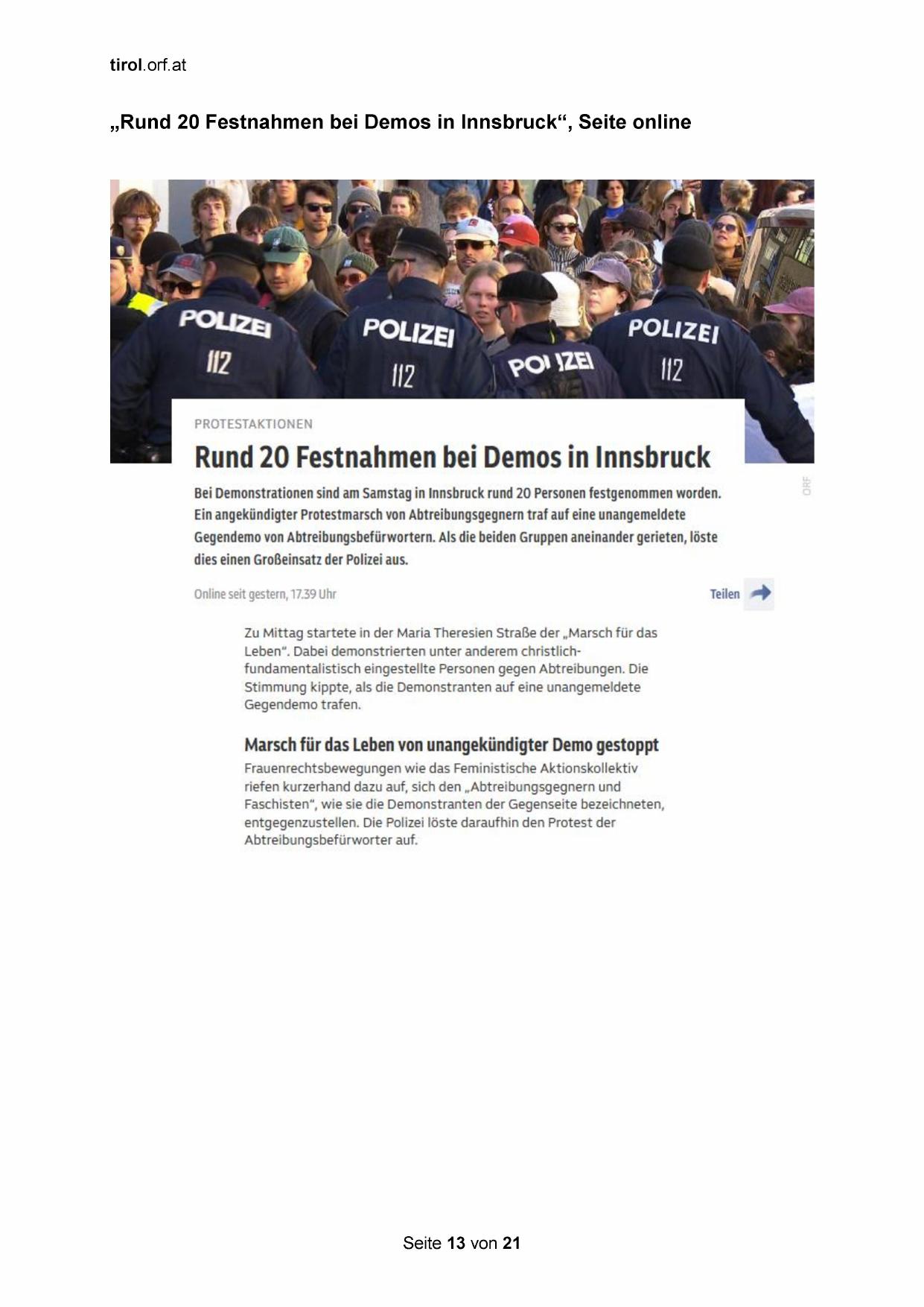 „Rund 20 Festnahmen bei Demos in Innsbruck“, Seite online