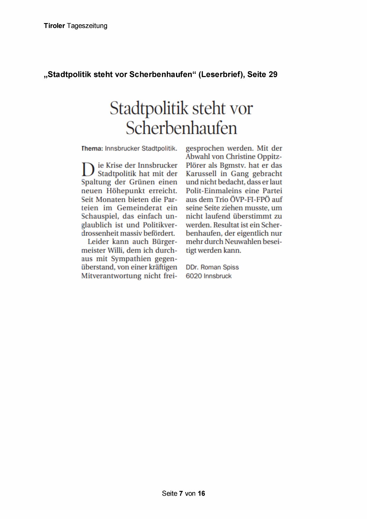„Stadtpolitik steht vor Scherbenhaufen“ (Leserbrief), Seite 29