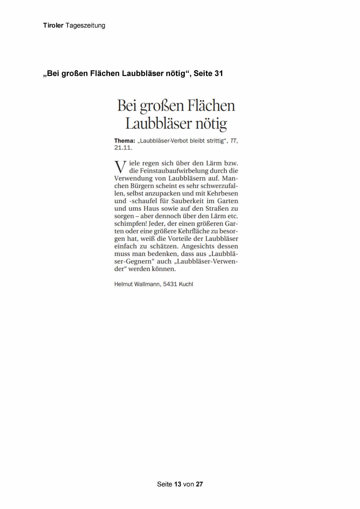 Thema: „Laubbläser-Verbot bleibt strittig“, TT,