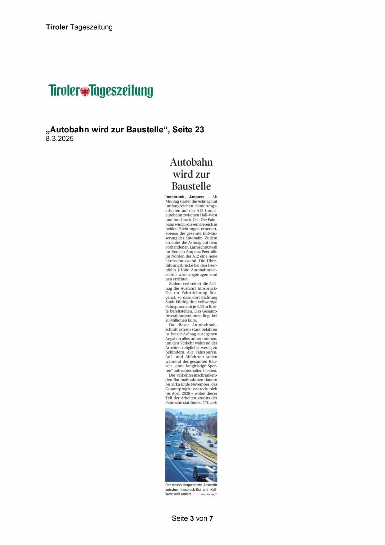 umfangreichen Sanierungsarbeiten auf der A12 Inntalautobahn zwischen Hall-West