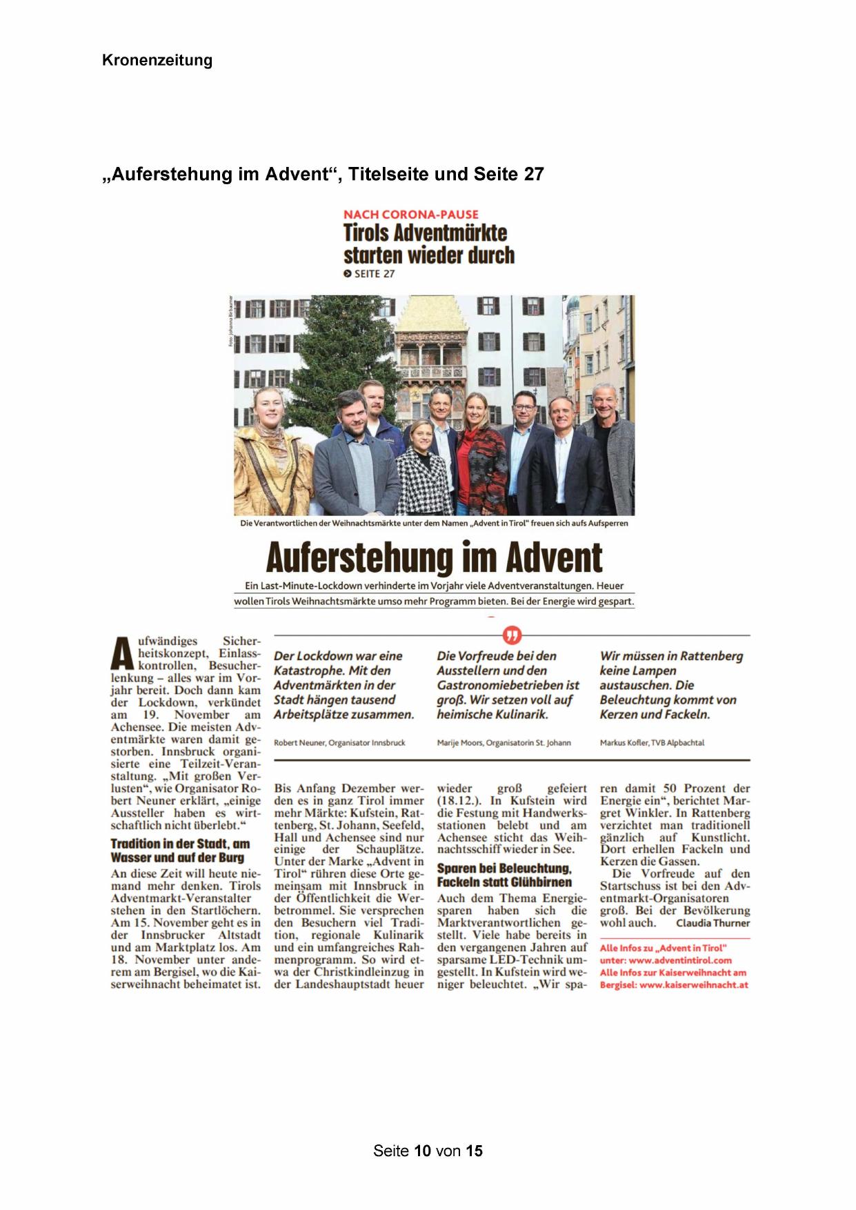 Achensee. Die meisten Adventmärkte waren damit gestorben. Innsbruck organisierte eine Teilzeit-Veranstaltung. „Mit großen Verlusten“, wie Organisator Robert Neuner erklärt, „einige