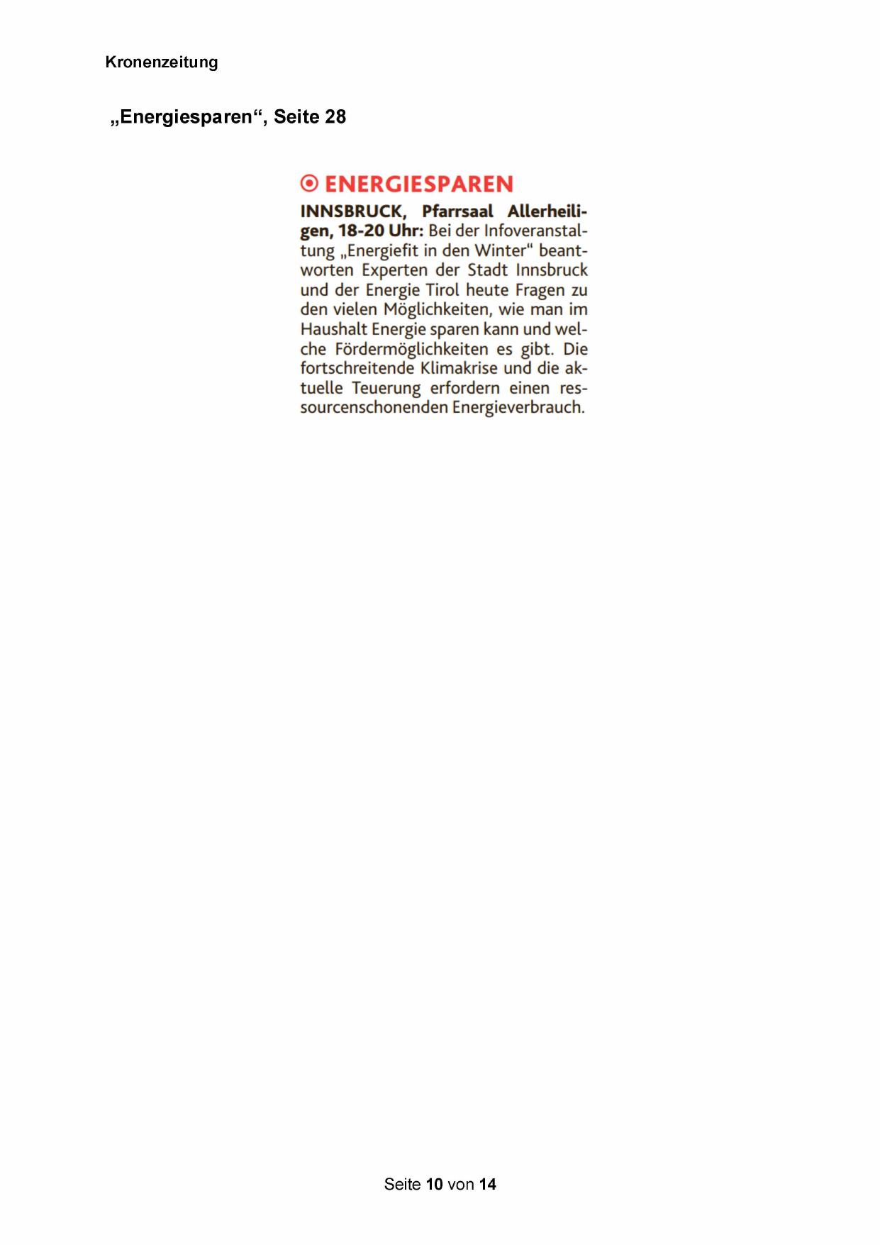 INNSBRUCK, Pfarrsaal Allerheiligen, 18-20 Uhr: Bei der Infoveranstaltung „Energiefit in den Winter“ beantworten Experten der Stadt Innsbruck