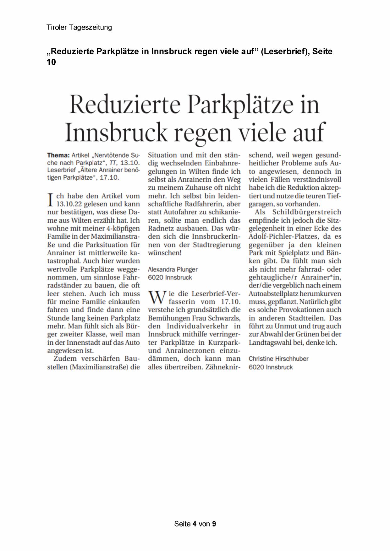 „Reduzierte Parkplätze in Innsbruck regen viele auf“ (Leserbrief), Seite