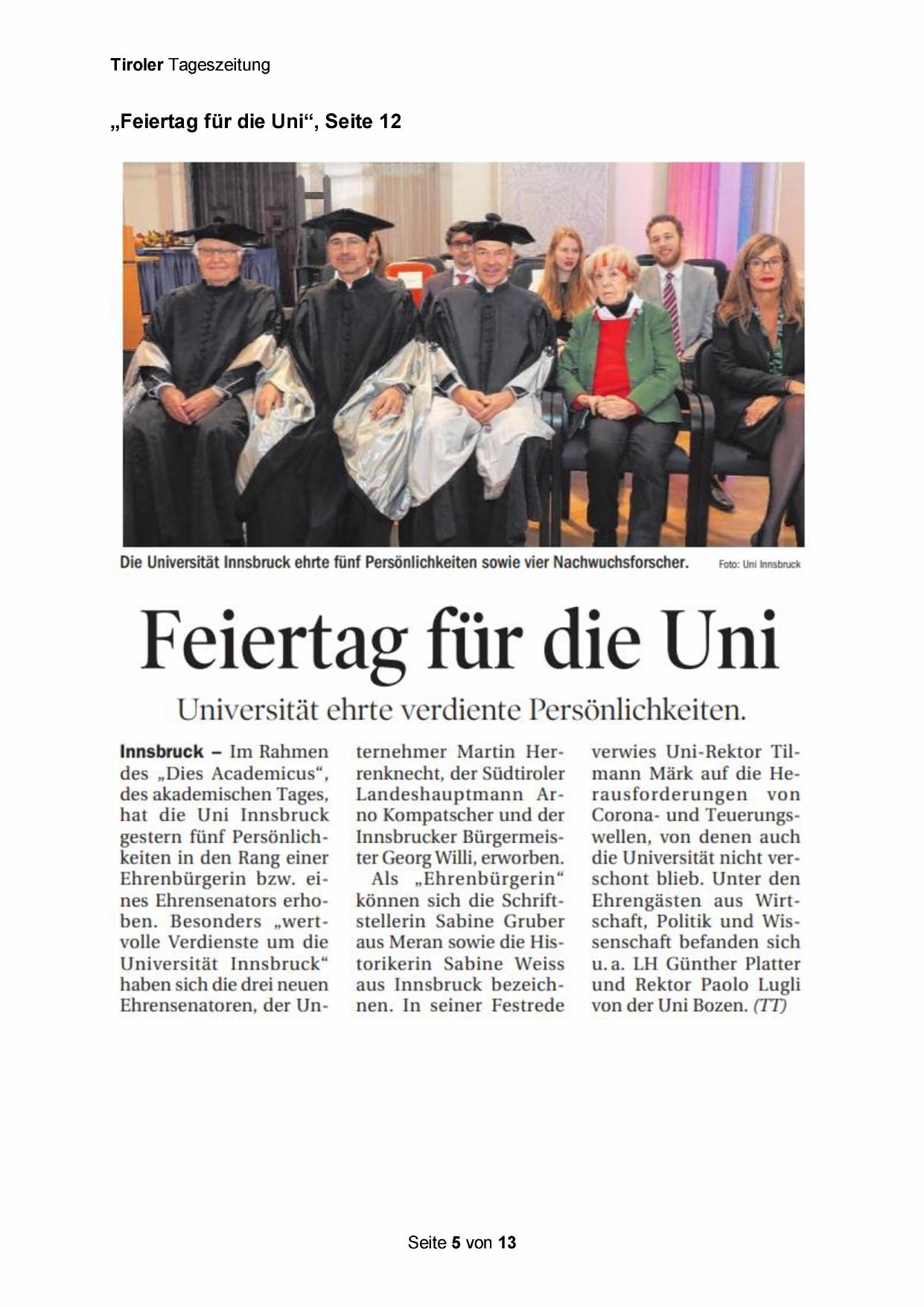 Die Universität Innsbruck ehrte fünf Persönlichkeiten sowie vier Nachwuchsforscher.