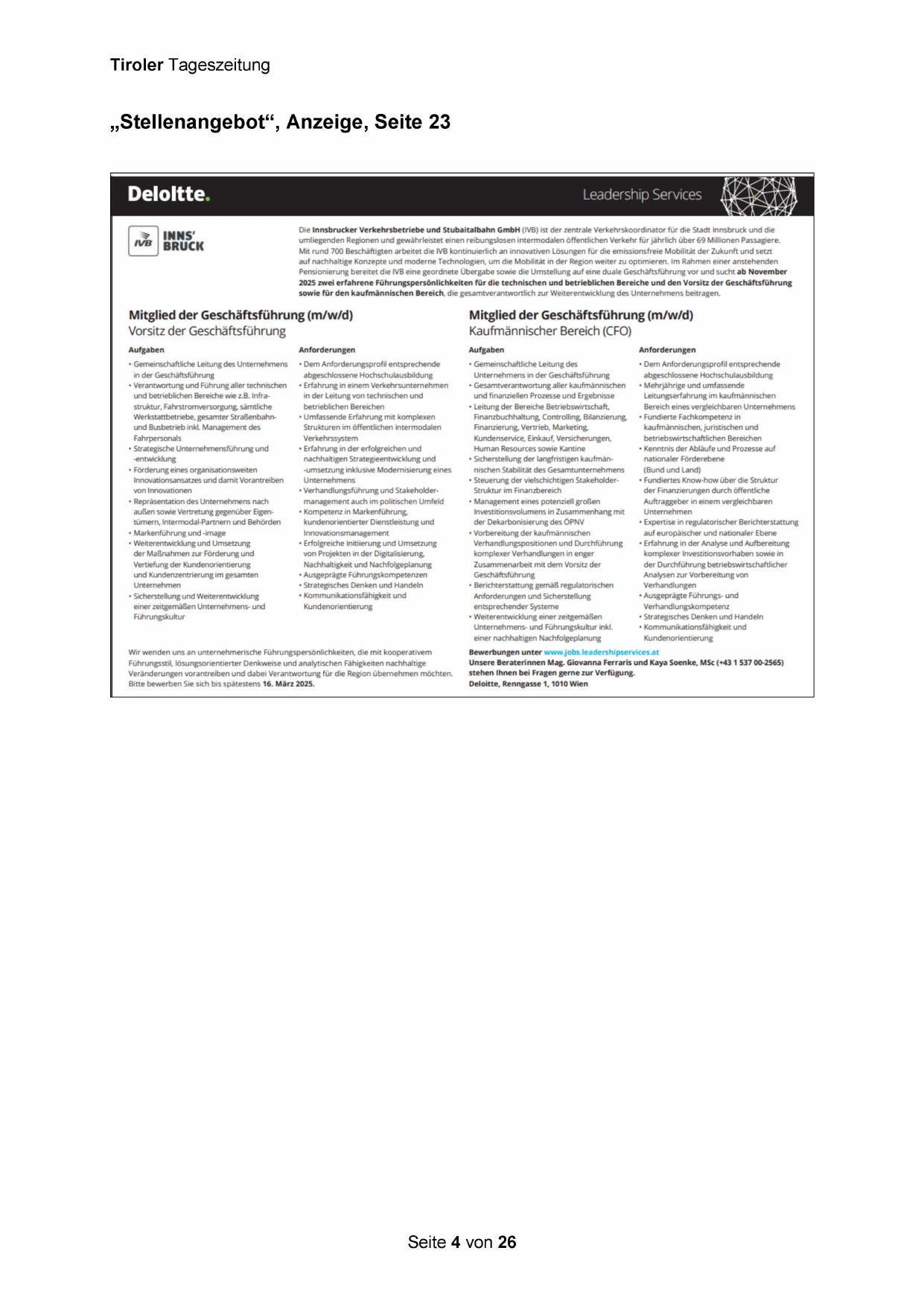 Pensionierung bereitet die IVB eine geordnete Übergabe sowie die Umstellung auf eine duale Geschäftsführung vor und sucht ab November