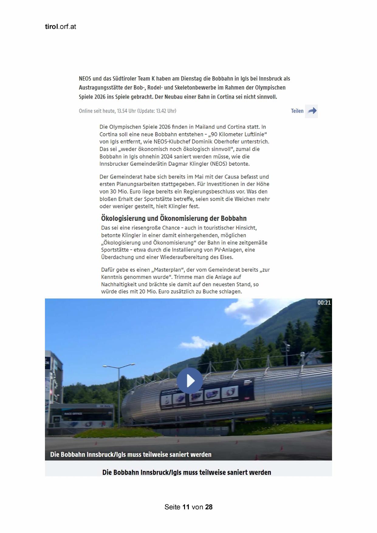 Bobbahn in Igls ohnehin 2024 saniert werden müsse, wie die