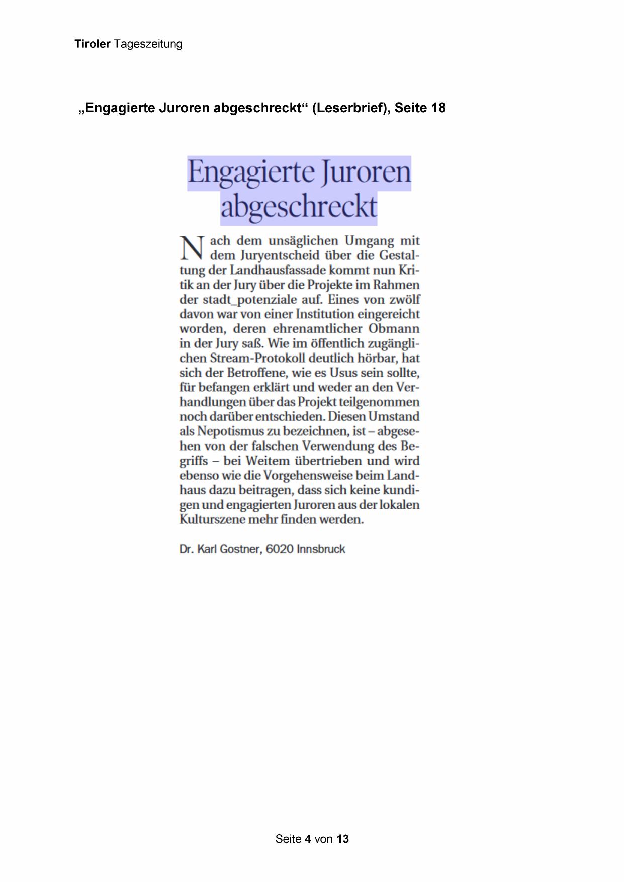 „Engagierte Juroren abgeschreckt“ (Leserbrief), Seite 18