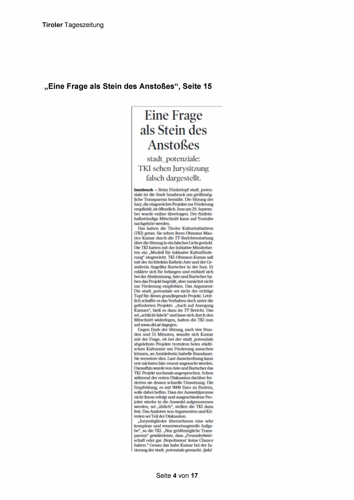 Innsbruck — Beim Fördertopf stadt_potenziale ist die Stadt Innsbruck um größtmögliche Transparenz bemührt. Die Sitzung der