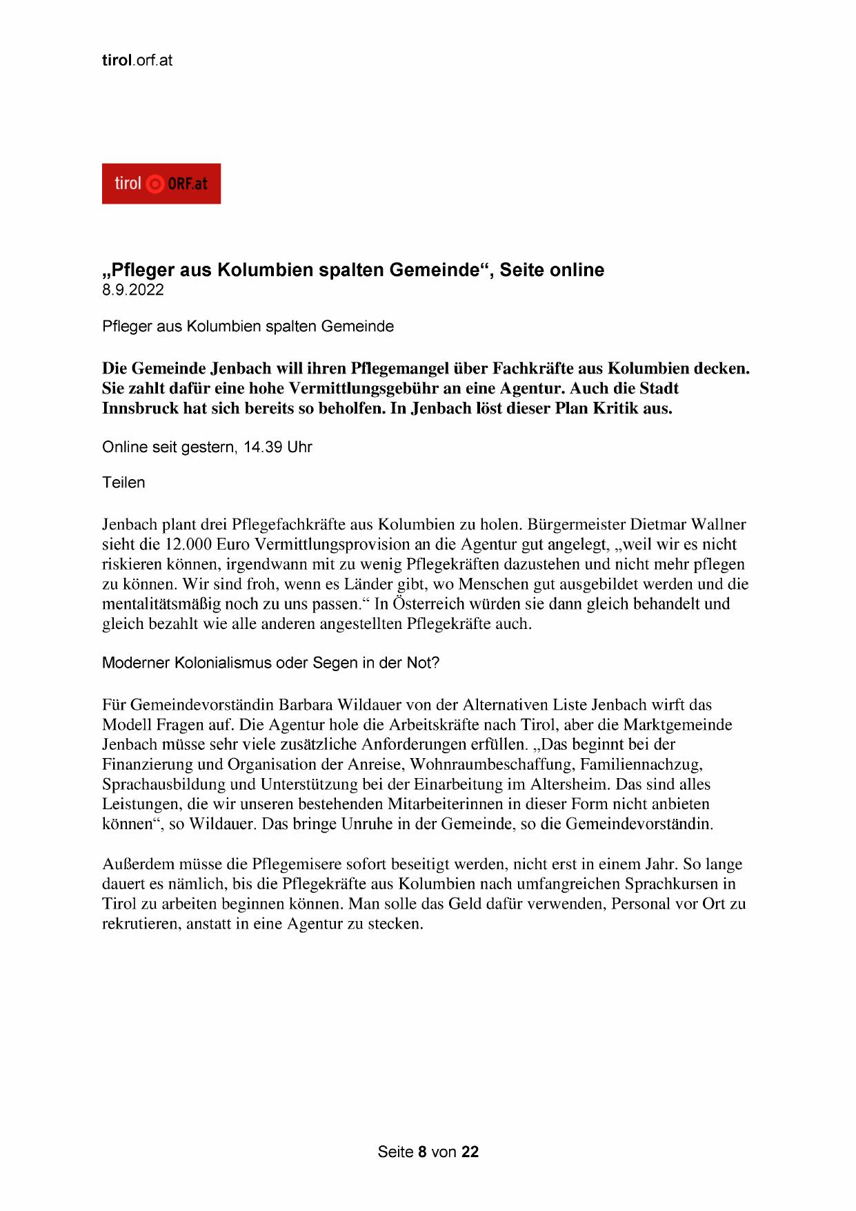 „Pfleger aus Kolumbien spalten Gemeinde“, Seite online