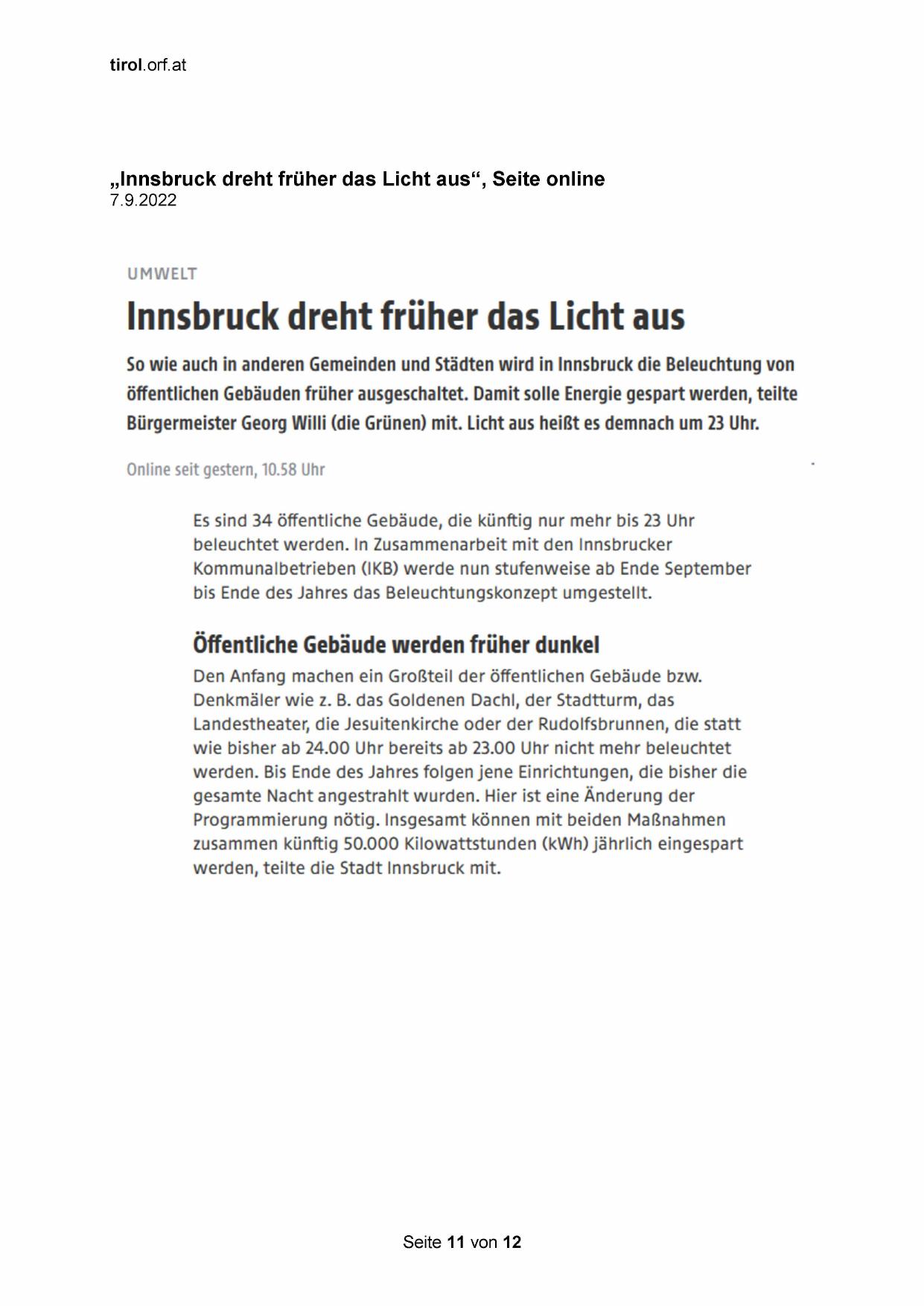 „Innsbruck dreht früher das Licht aus“, Seite online