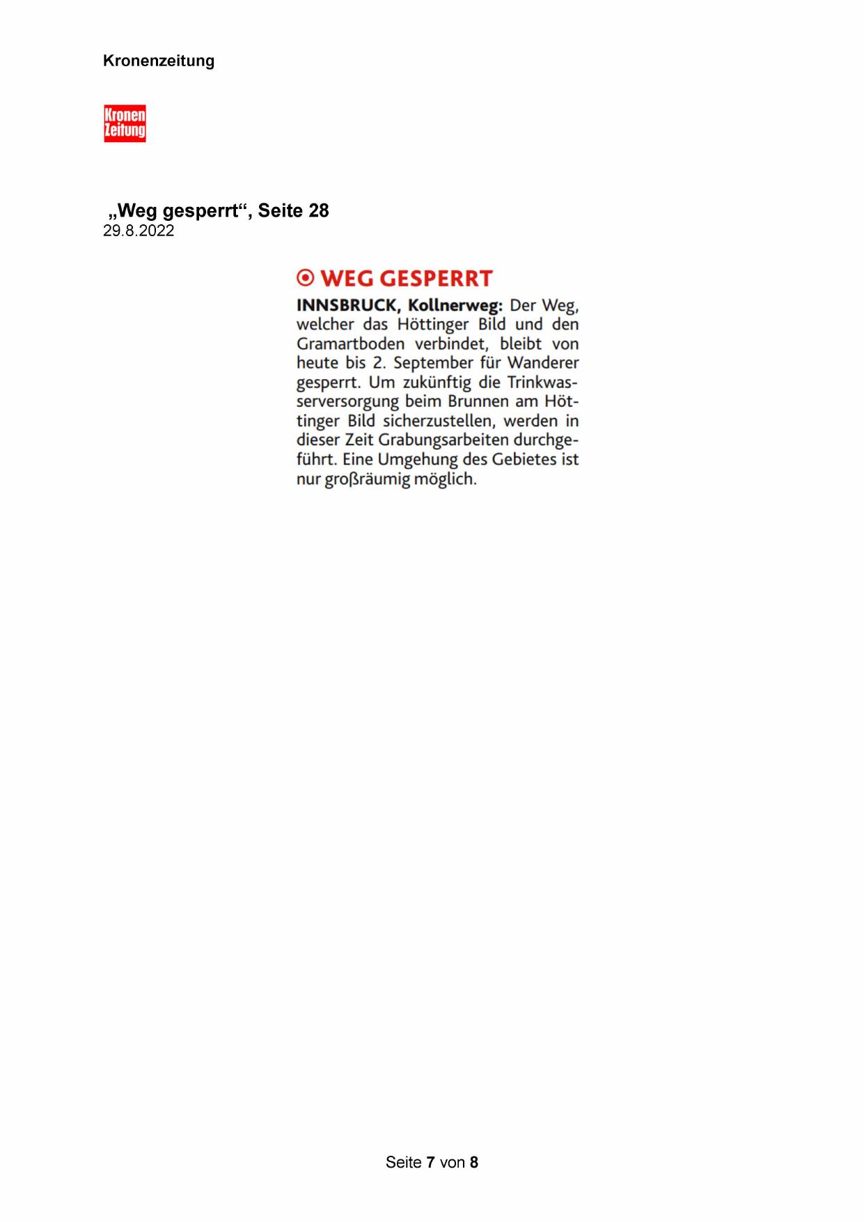 gesperrt. Um zukünftig die Trinkwasserversorgung beim Brunnen am Höttinger Bild sicherzustellen, werden in