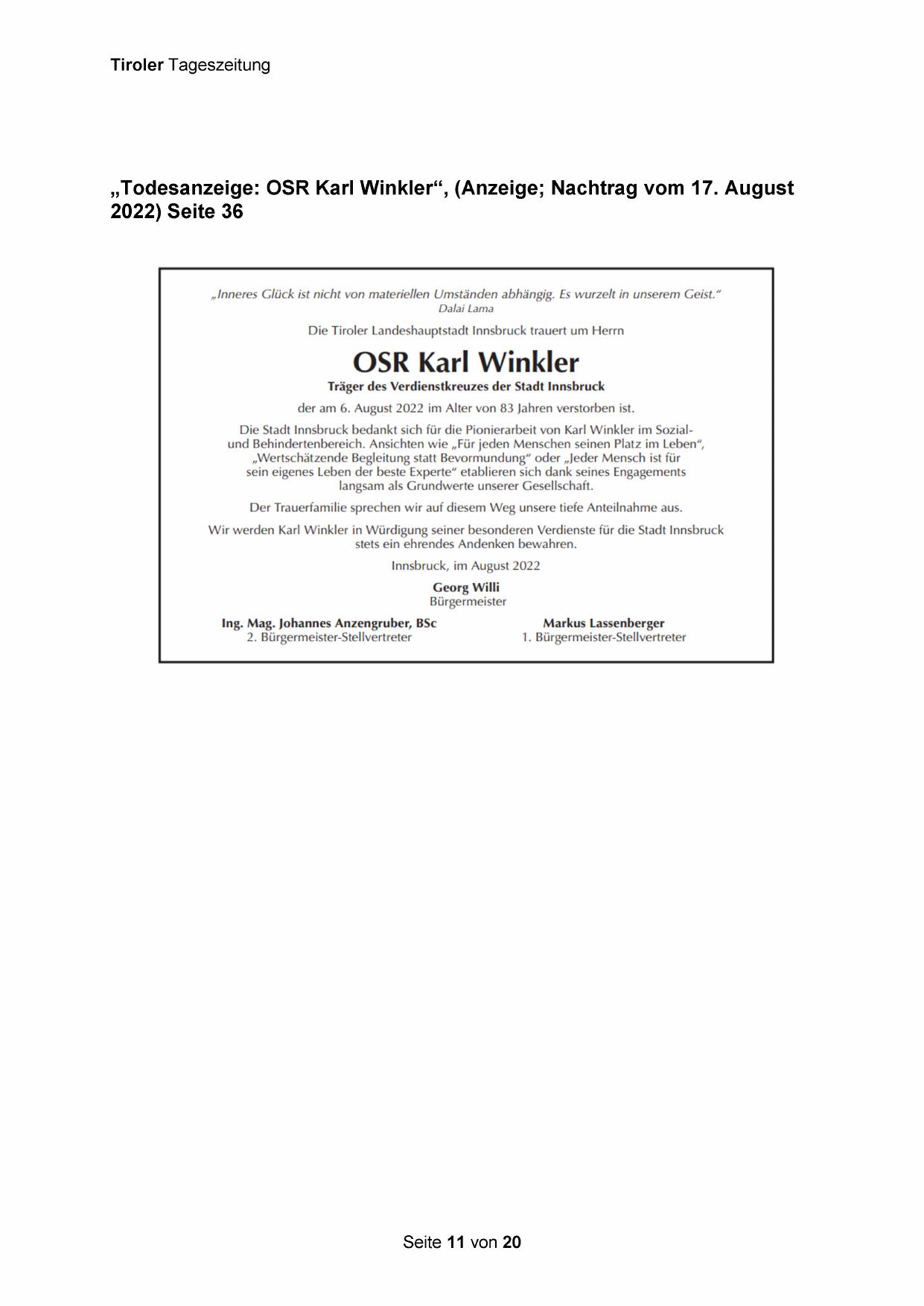 Die Stadt Innsbruck bedankt sich für die Pionierarbeit von Karl Winkler im Sozialund Behindertenbereich. Ansichten wie „Für jeden Menschen seinen Platz im Leben“,