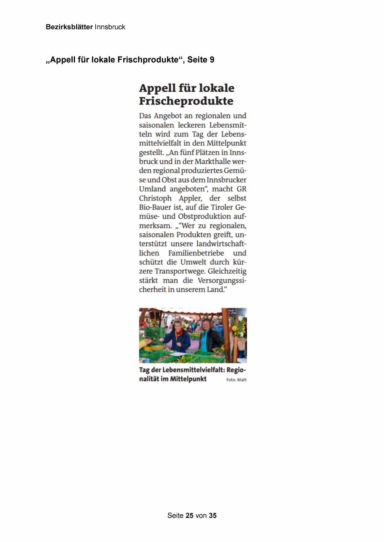 Bio-Bauer ist, auf die Tiroler Gemüse- und Obstproduktion aufmerksam. „“Wer zu regionalen,