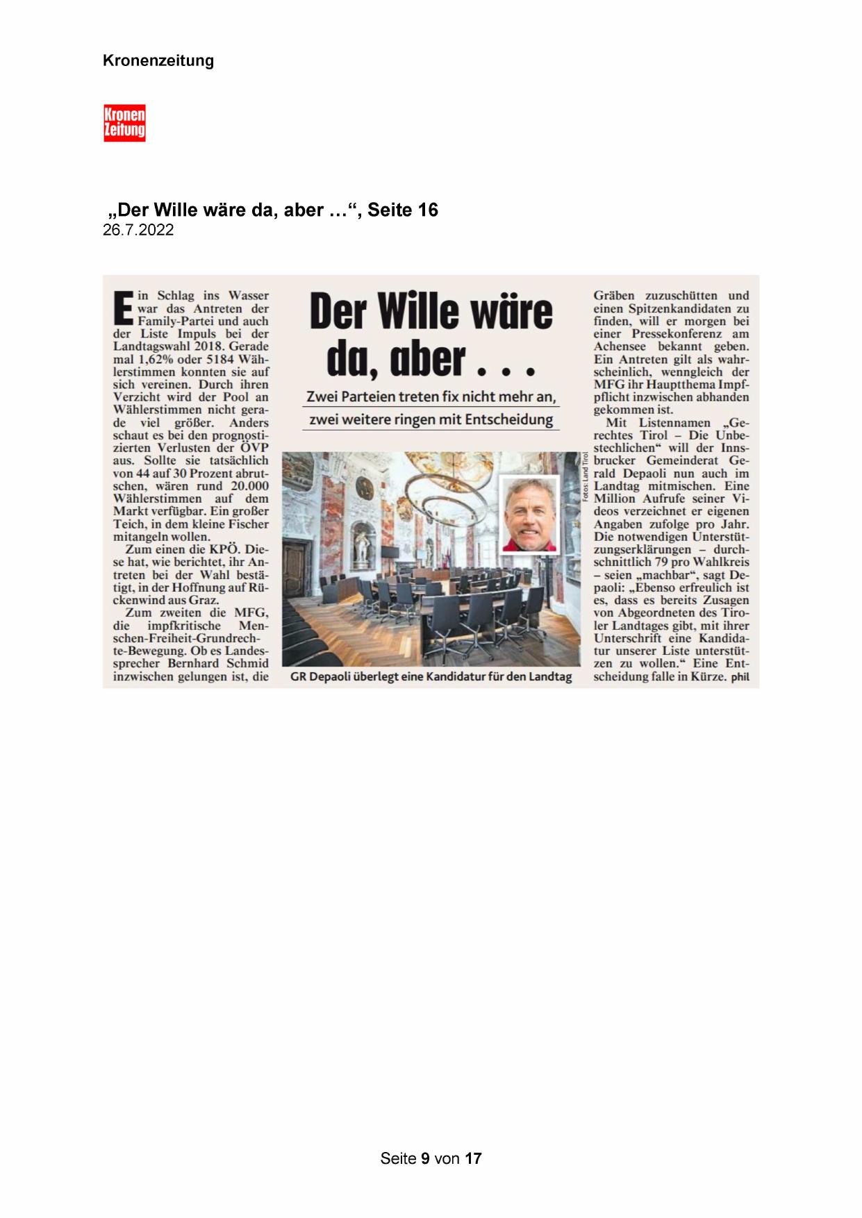 von Abgeordneten des Tiroler Landtages gibt, mit ihrer