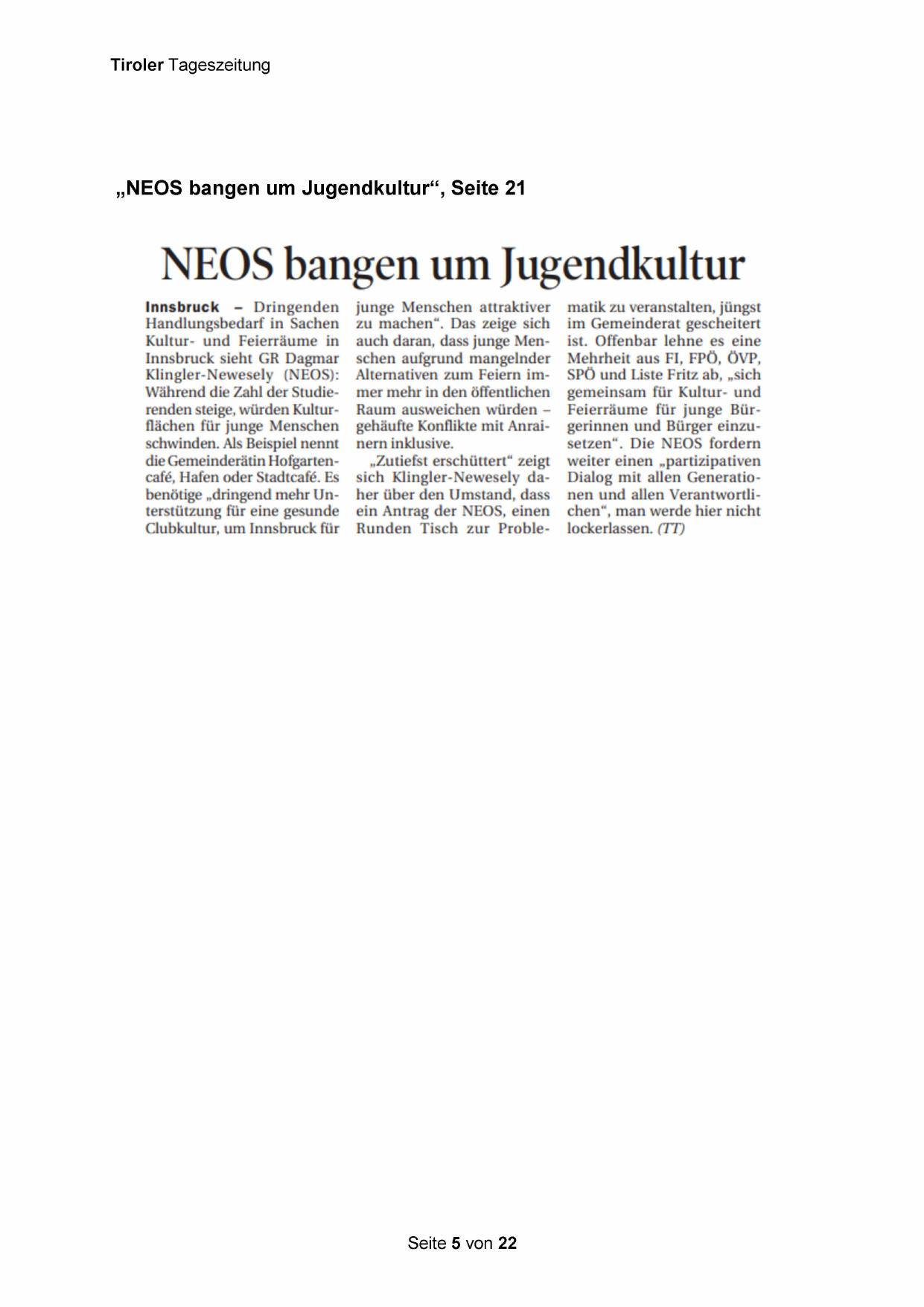 Feierräume für junge Bürgerinnen und Bürger einzusetzen“. Die NEOS fordern