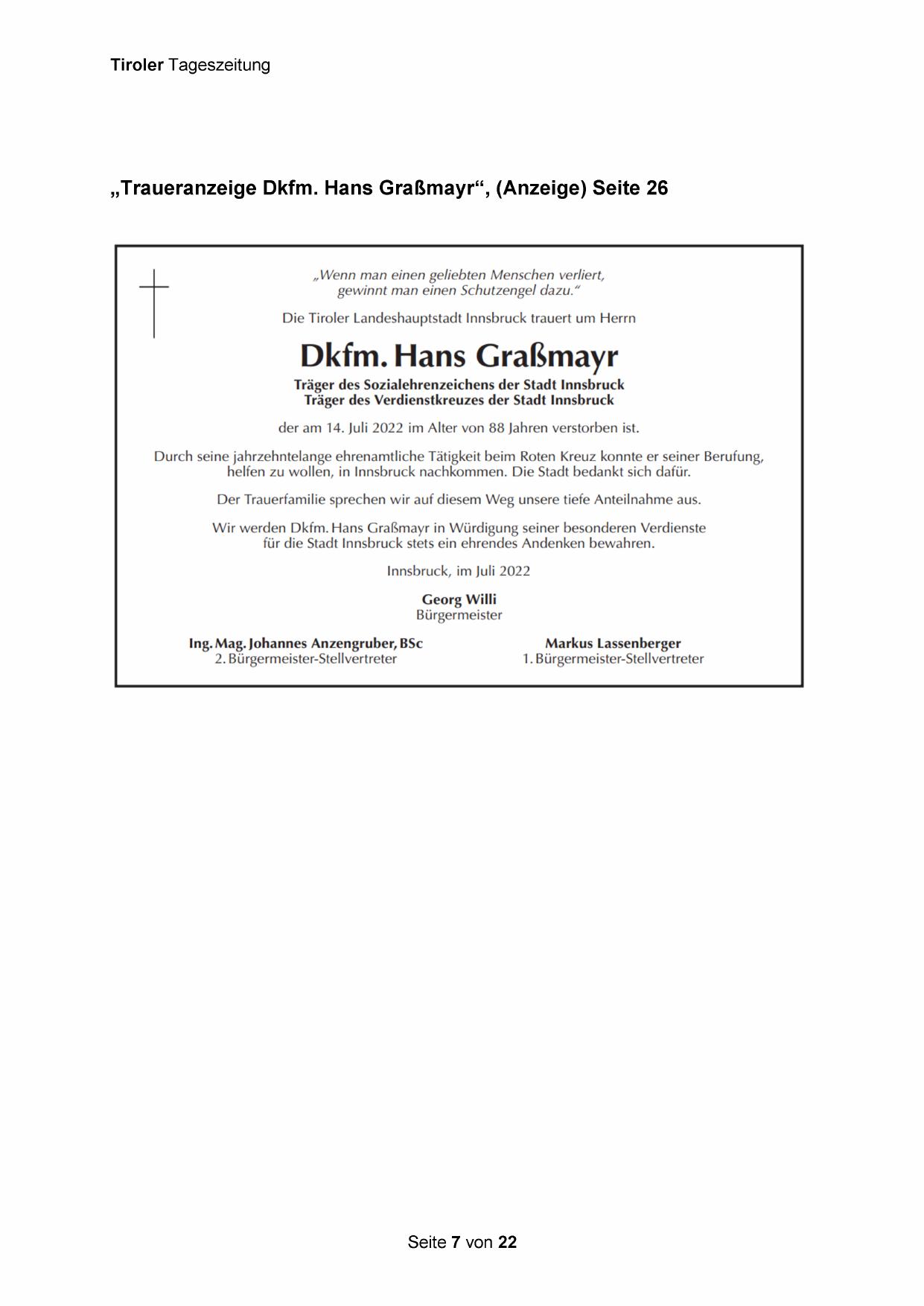 „Traueranzeige Dkfm. Hans Graßmayr“, (Anzeige) Seite 26