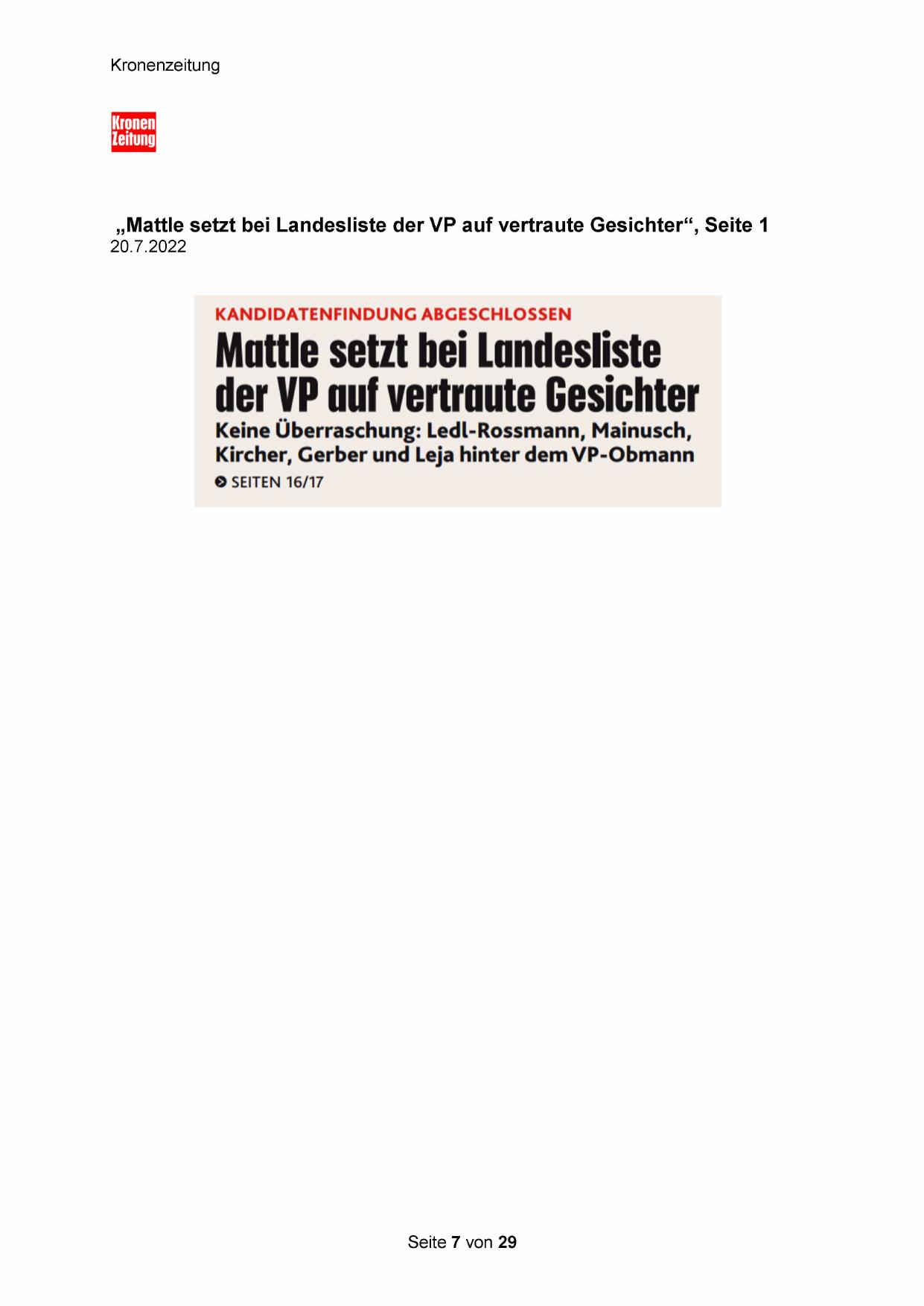 „Mattle setzt bei Landesliste der VP auf vertraute Gesichter“, Seite 1