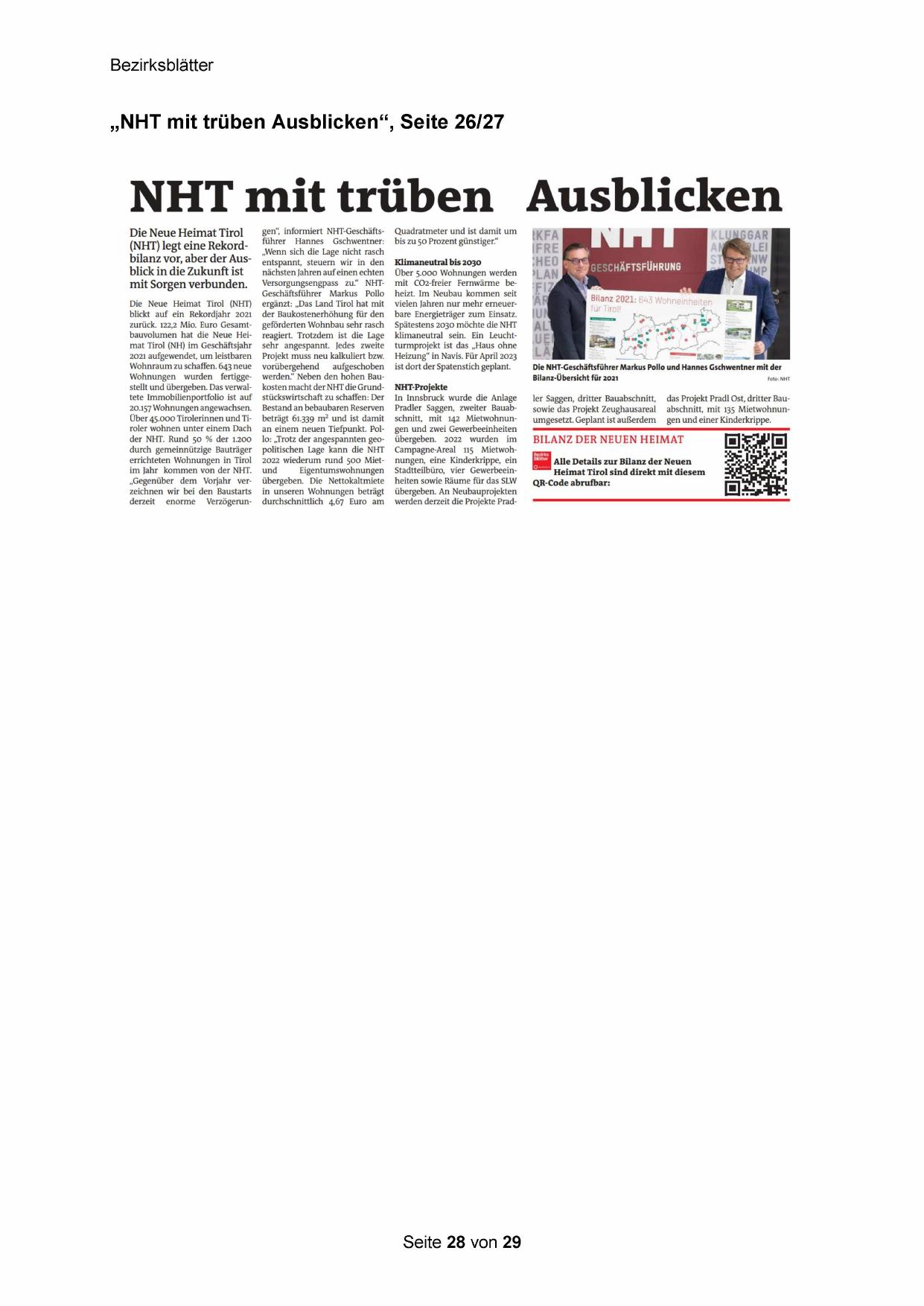 zurück. 122,2 Mio. Euro Gesamtbauvolumen hat die Neue Heimat Tirol (NH) im Geschäftsjahr