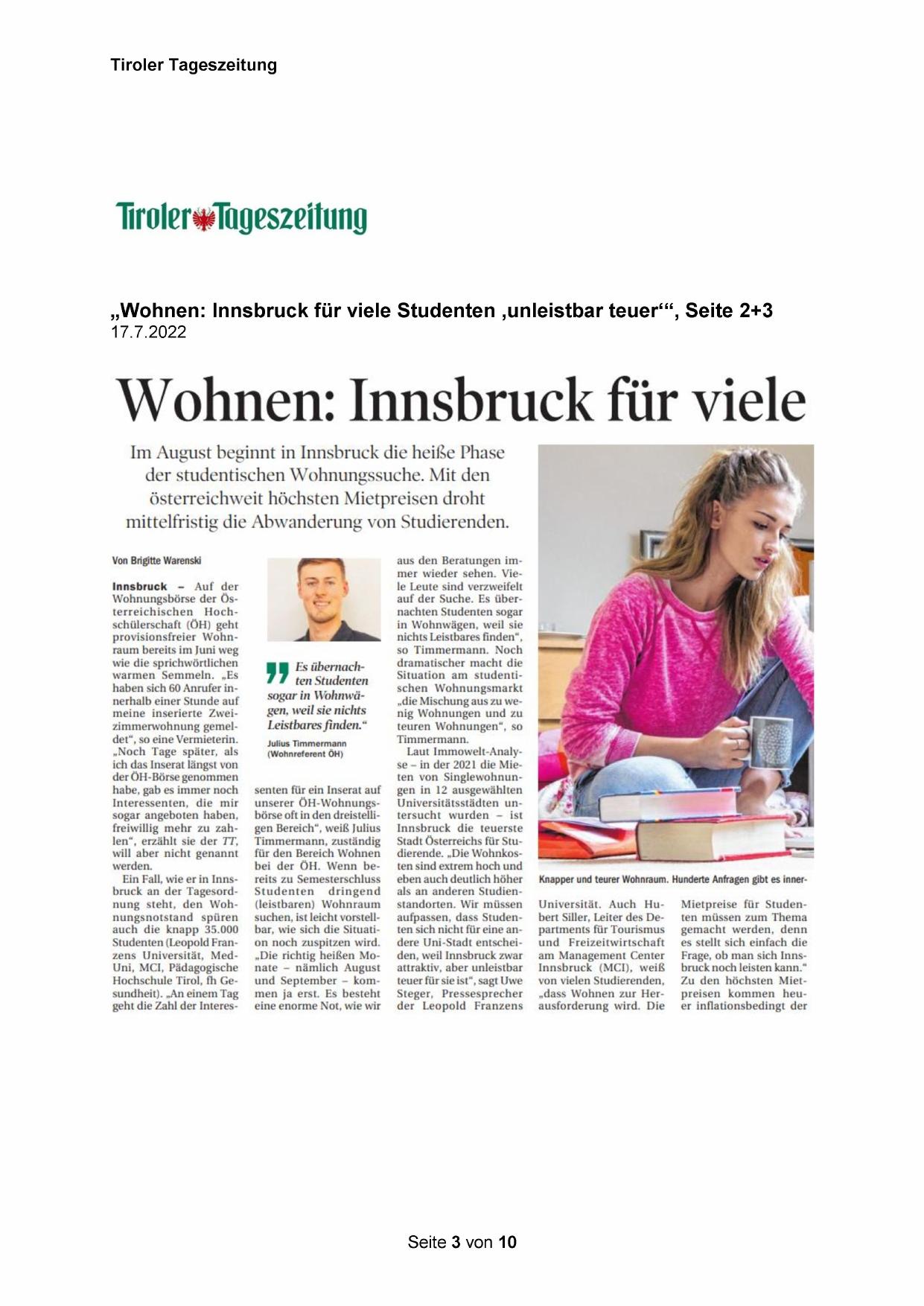 „Wohnen: Innsbruck für viele Studenten ‚unleistbar teuer‘“, Seite 2+3