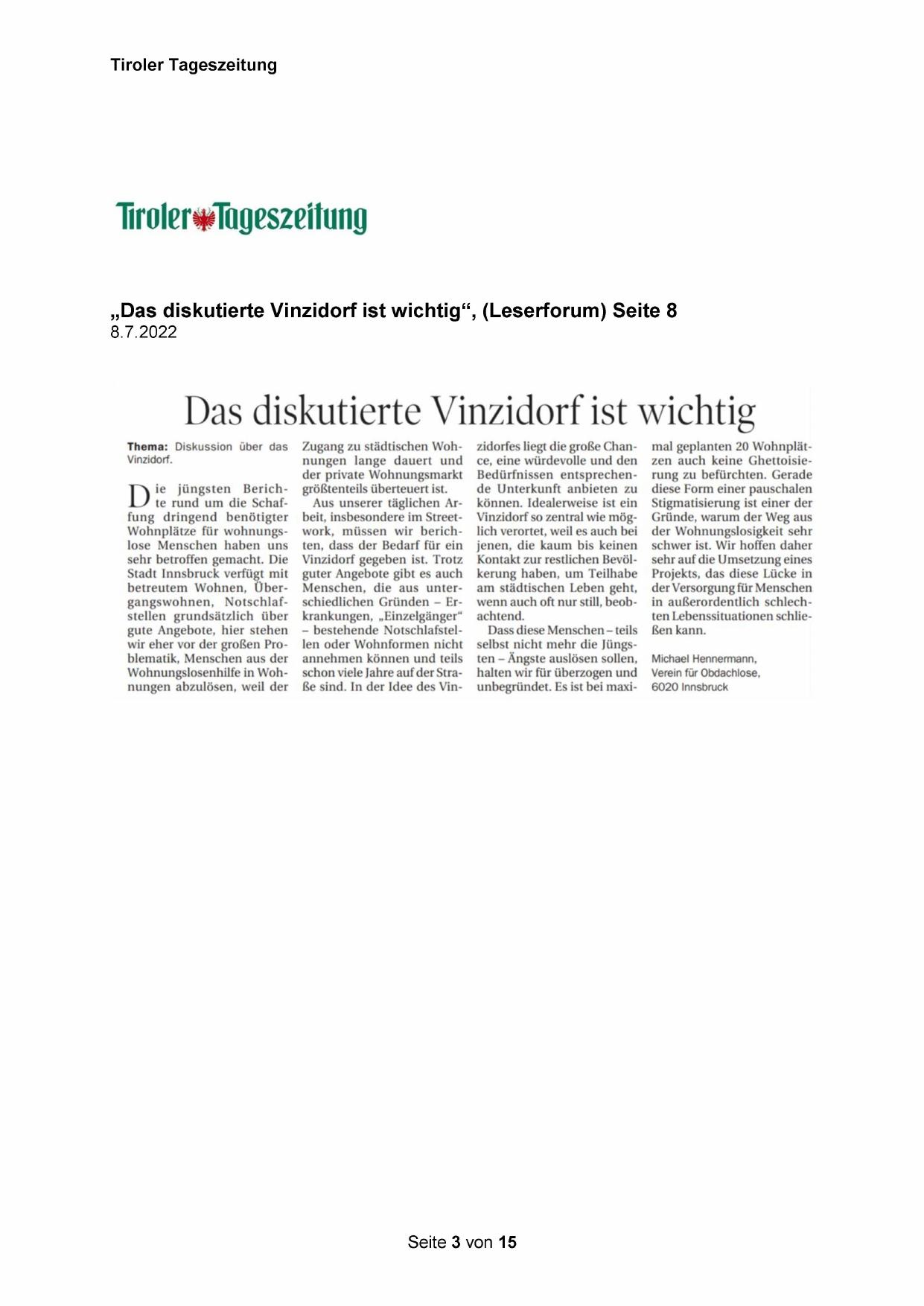„Das diskutierte Vinzidorf ist wichtig‘“, (Leserforum) Seite 8