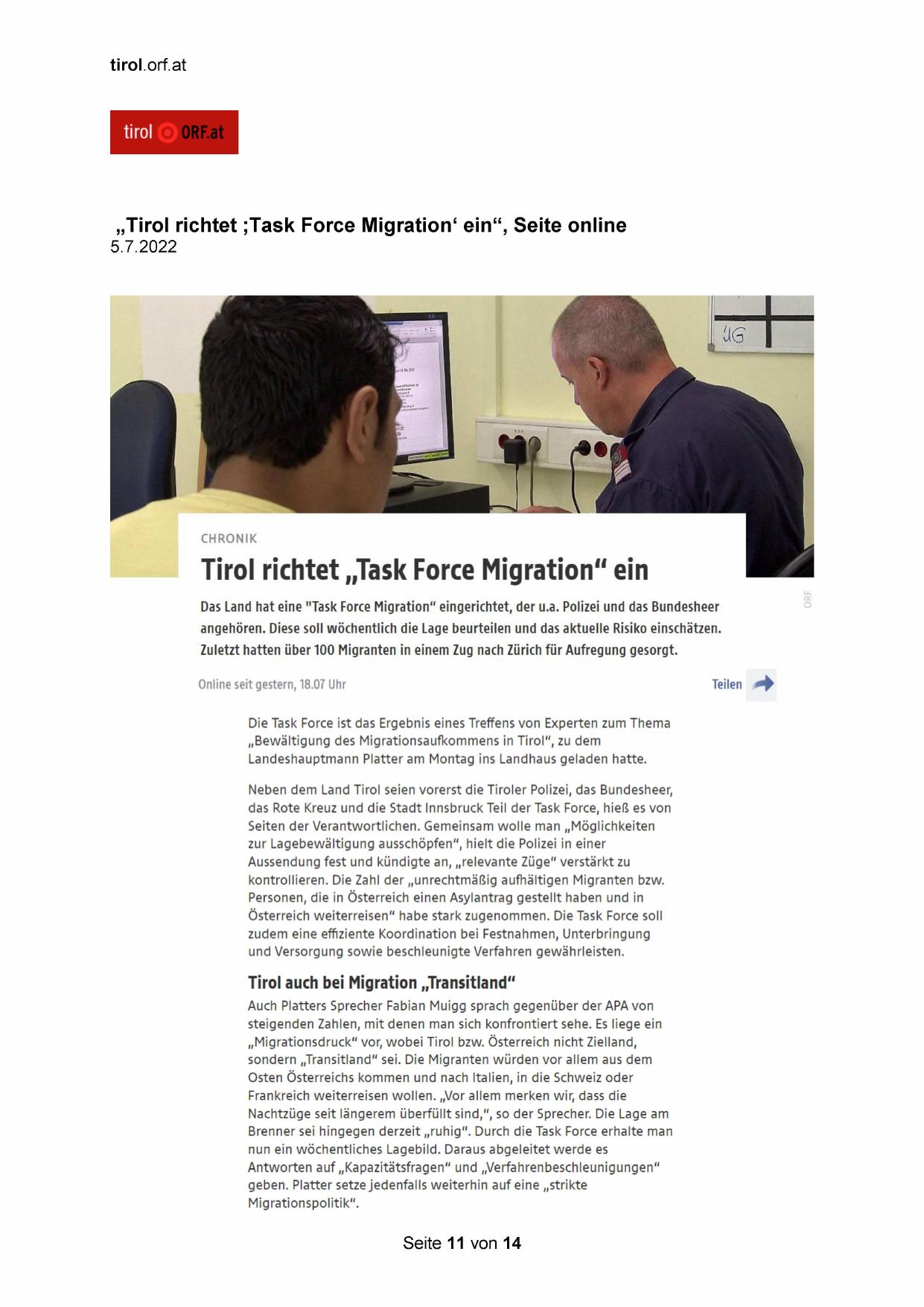 „Tirol richtet ;Task Force Migration‘ ein“, Seite online