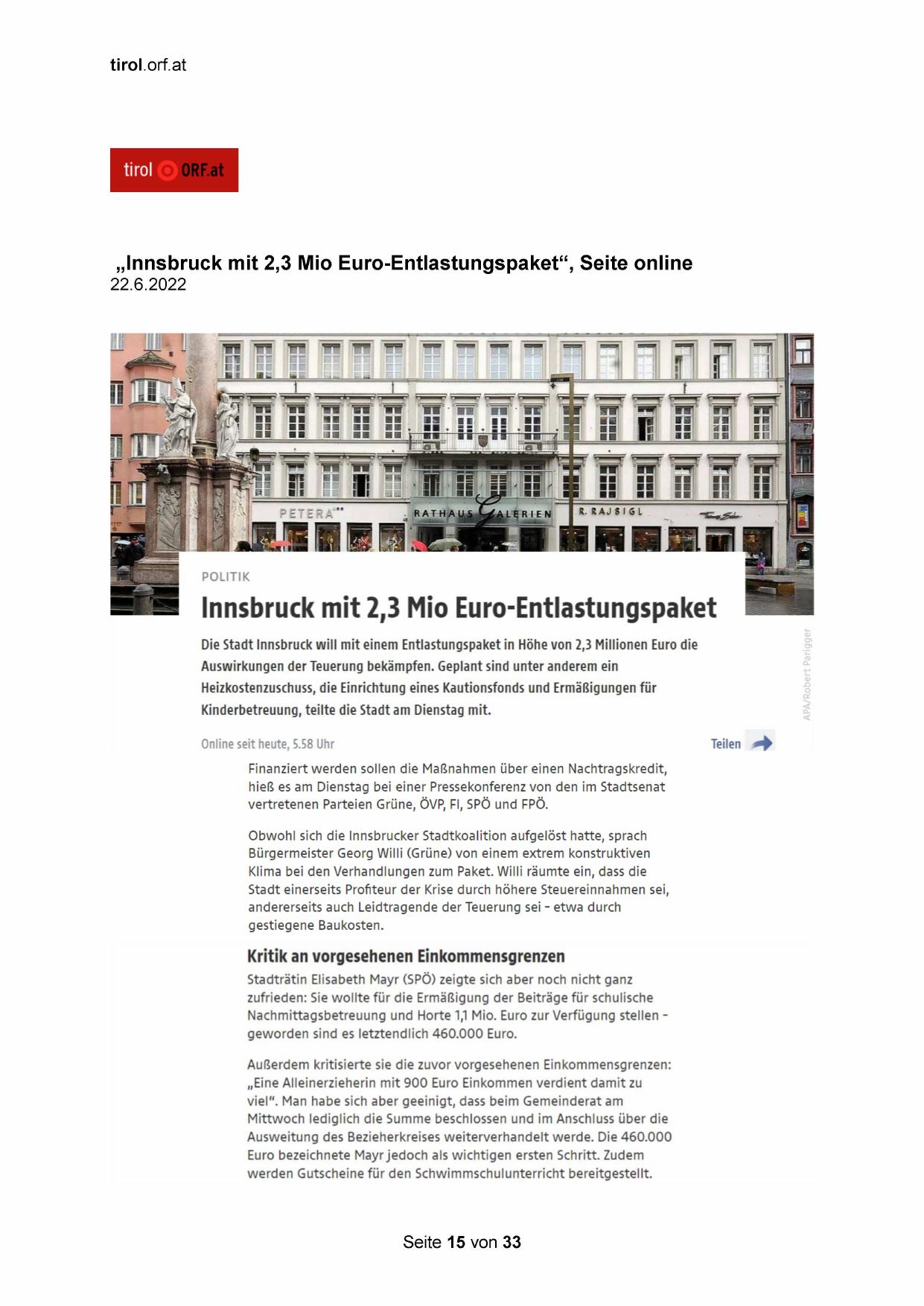 „Innsbruck mit 2,3 Mio Euro-Entlastungspaket“, Seite online