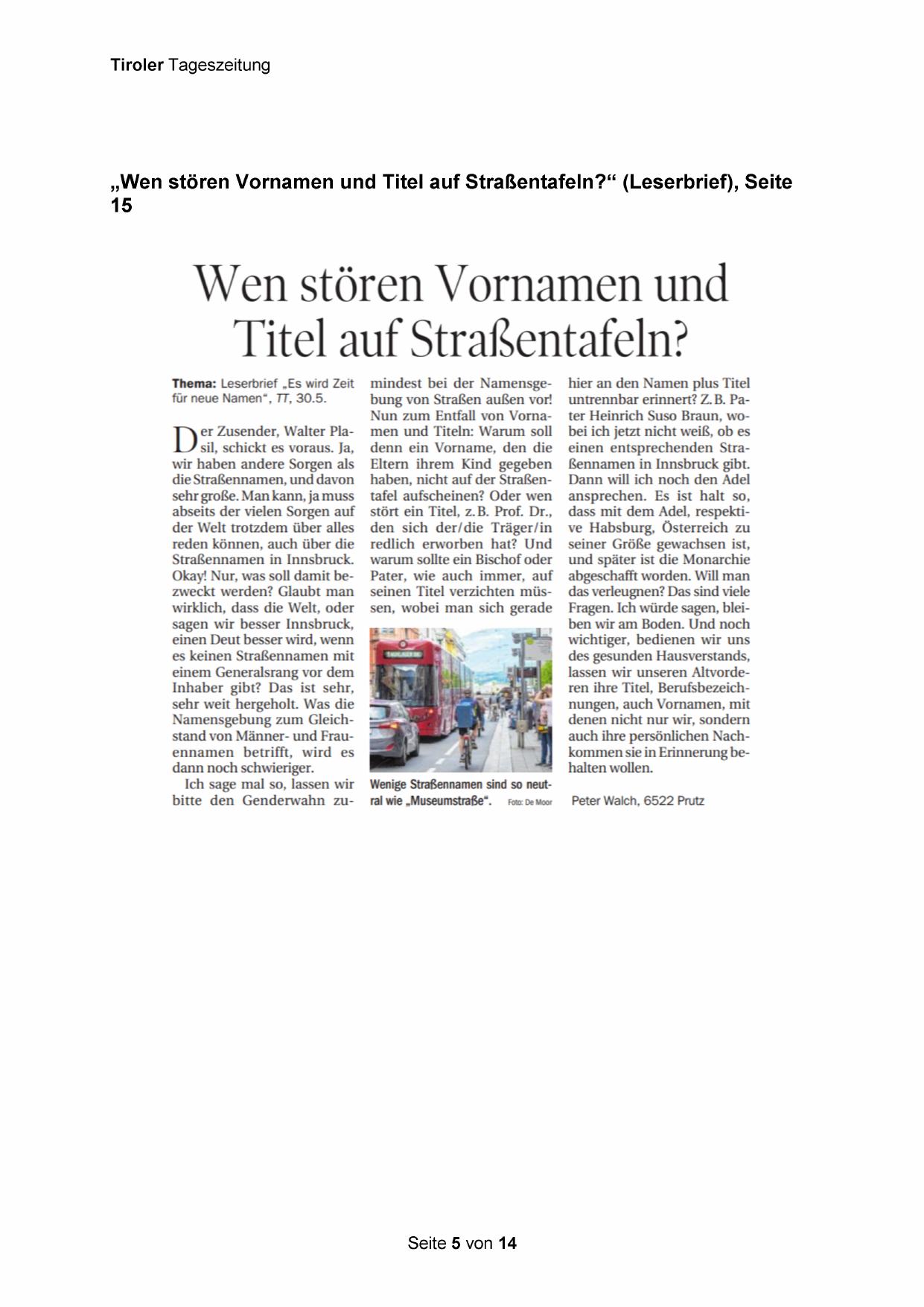„Wen stören Vornamen und Titel auf Straßentafeln?“ (Leserbrief), Seite