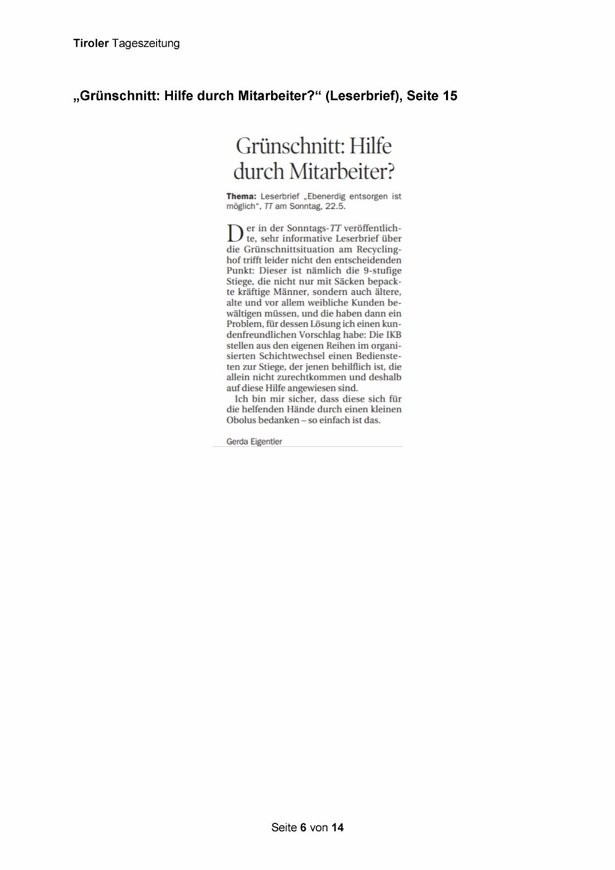 „Grünschnitt: Hilfe durch Mitarbeiter?“ (Leserbrief), Seite 15