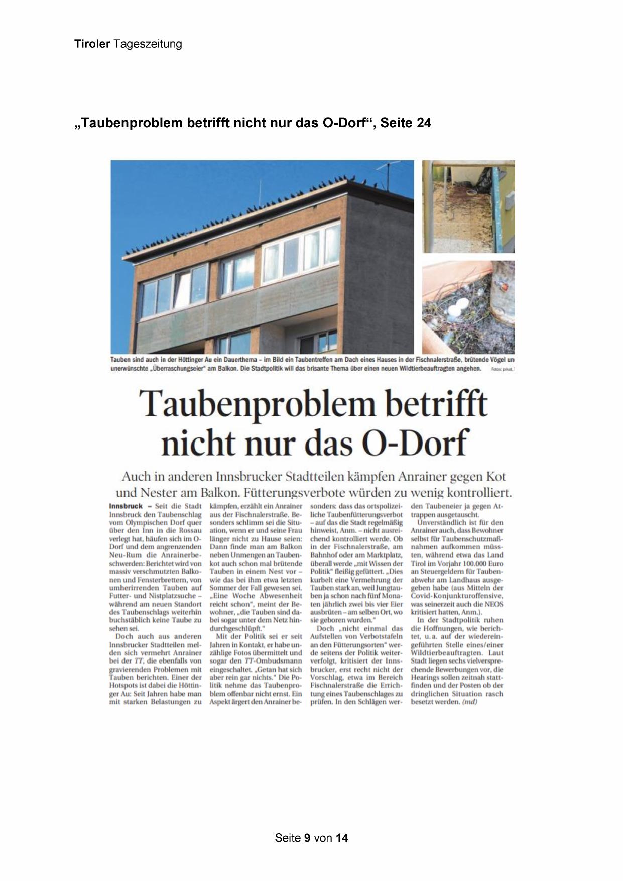 „Taubenproblem betrifft nicht nur das O-Dorf“, Seite 24