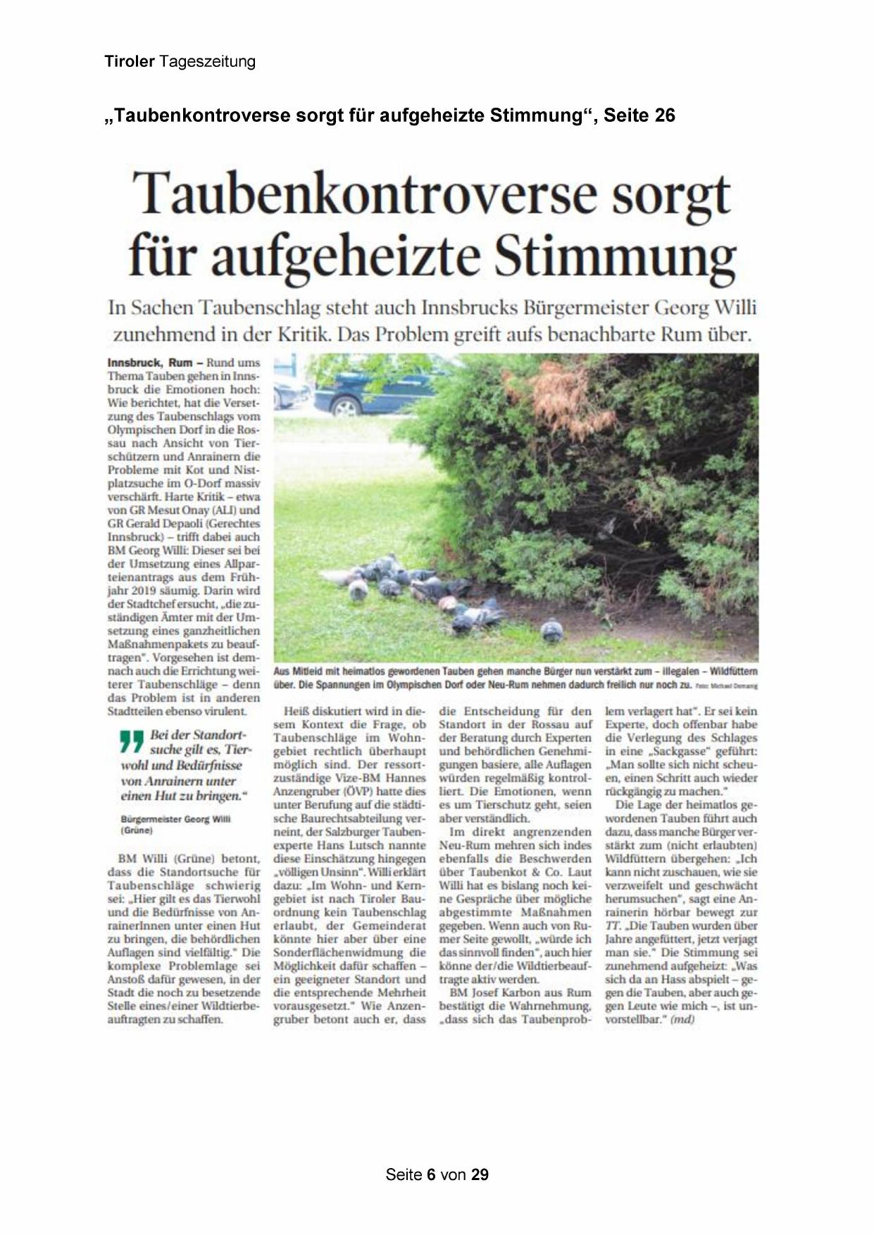 „Taubenkontroverse sorgt für aufgeheizte Stimmung“, Seite 26