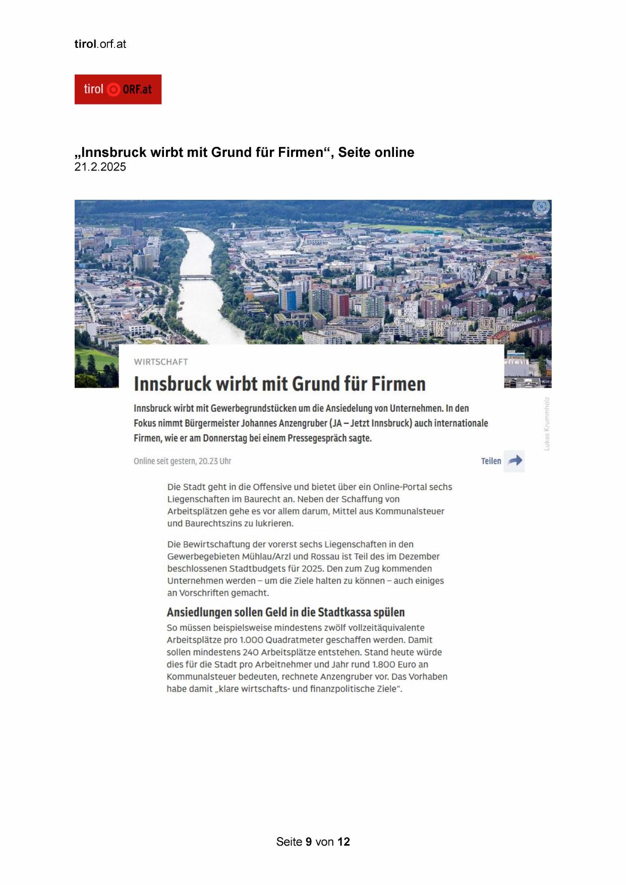 „Innsbruck wirbt mit Grund für Firmen“, Seite online