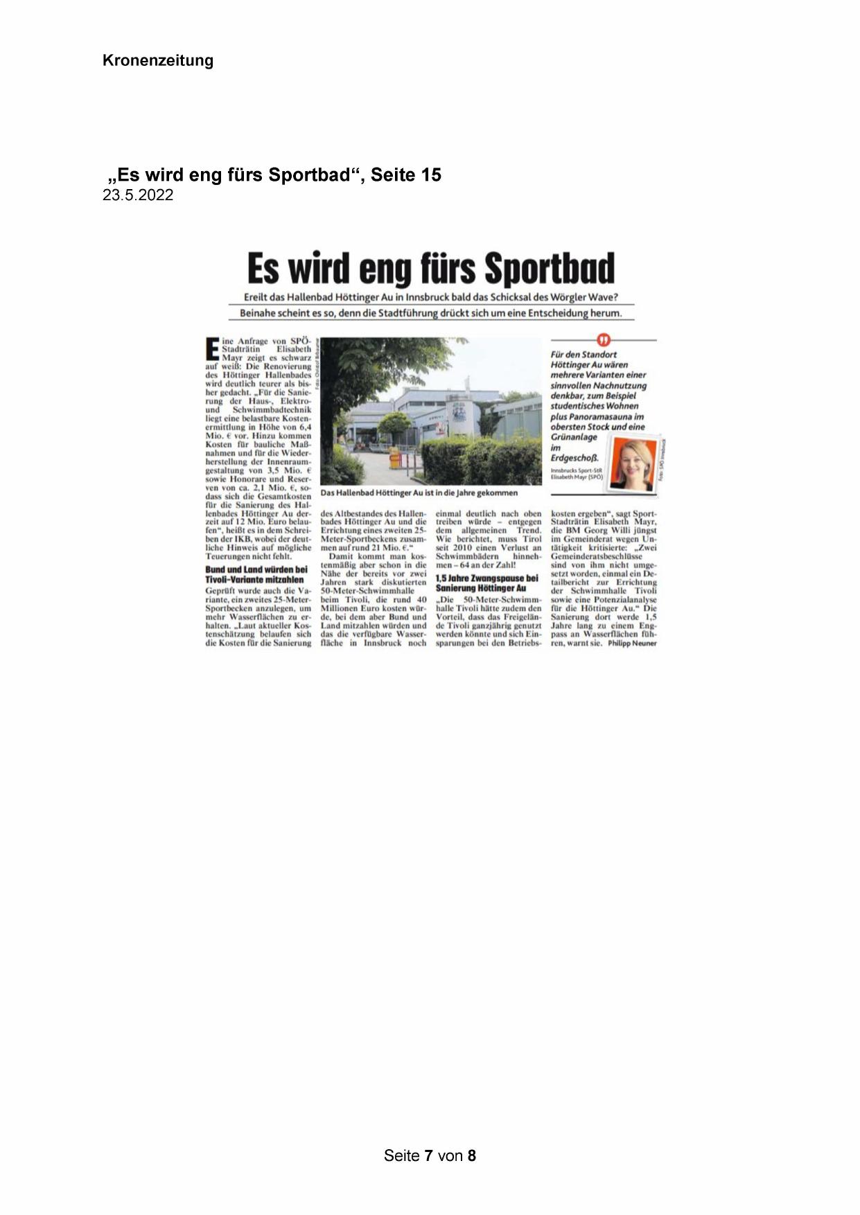 für die Sanierung des Hallenbades Höttinger Au derzeit auf 12 Mio, Euro belaufen*“, heißt es in dem Schreiben der IKB, wobei der deutliche Hinweis auf mögliche