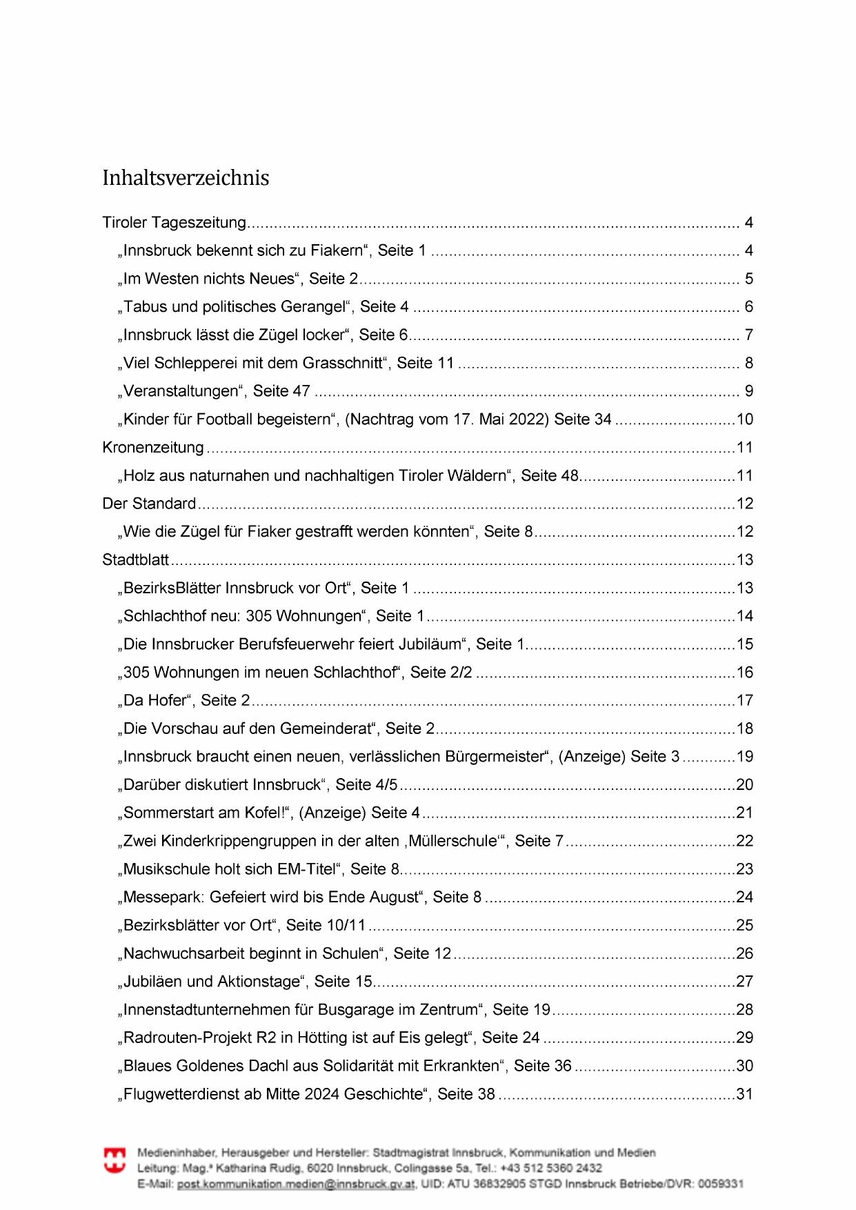 „Innsbruck braucht einen neuen, verlässlichen Bürgermeister“, (Anzeige) Seite 3............ 19