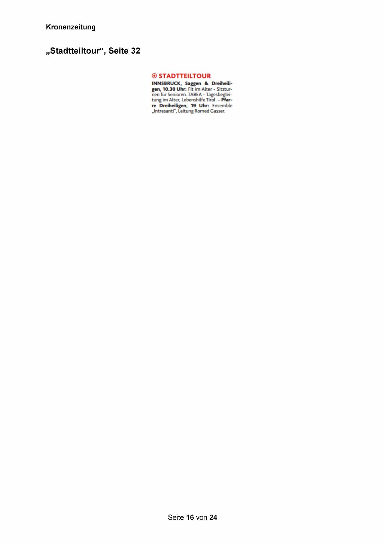 INNSBRUCK, Saggen & Dreiheiligen, 10.30 Uhr: Fit im Alter - Sitzturnen für Senioren. TABEA — Tagesbegleitung im Alter, Lebenshilfe Tirol. — Pfarre Dreiheiligen, 19 Uhr: Ensemble