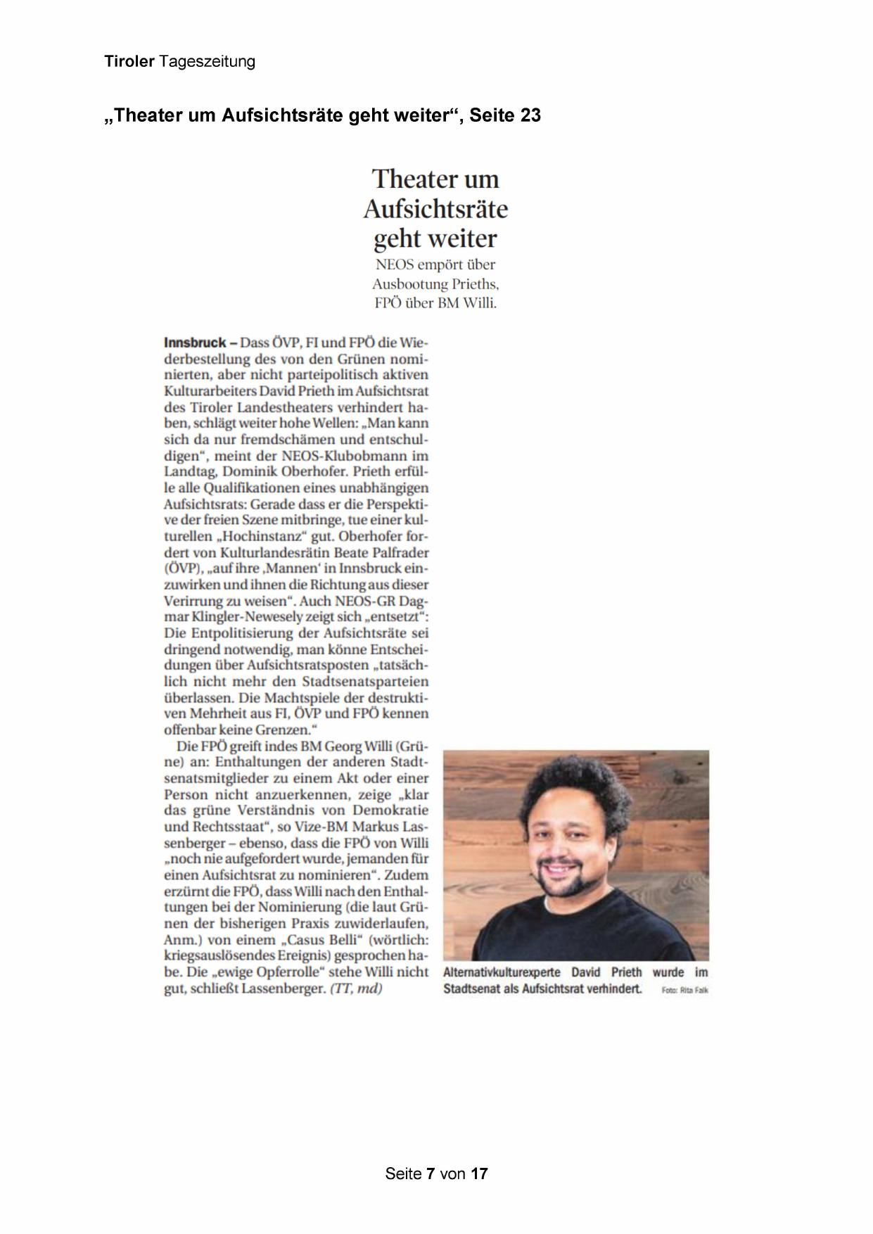 Aufsichtsrats: Gerade dass er die Perspektive der freien Szene mitbringe, tue einer kulturellen „Hochinstanz“ gut. Oberhofer fordert von Kulturlandesrätin Beate Palfrader