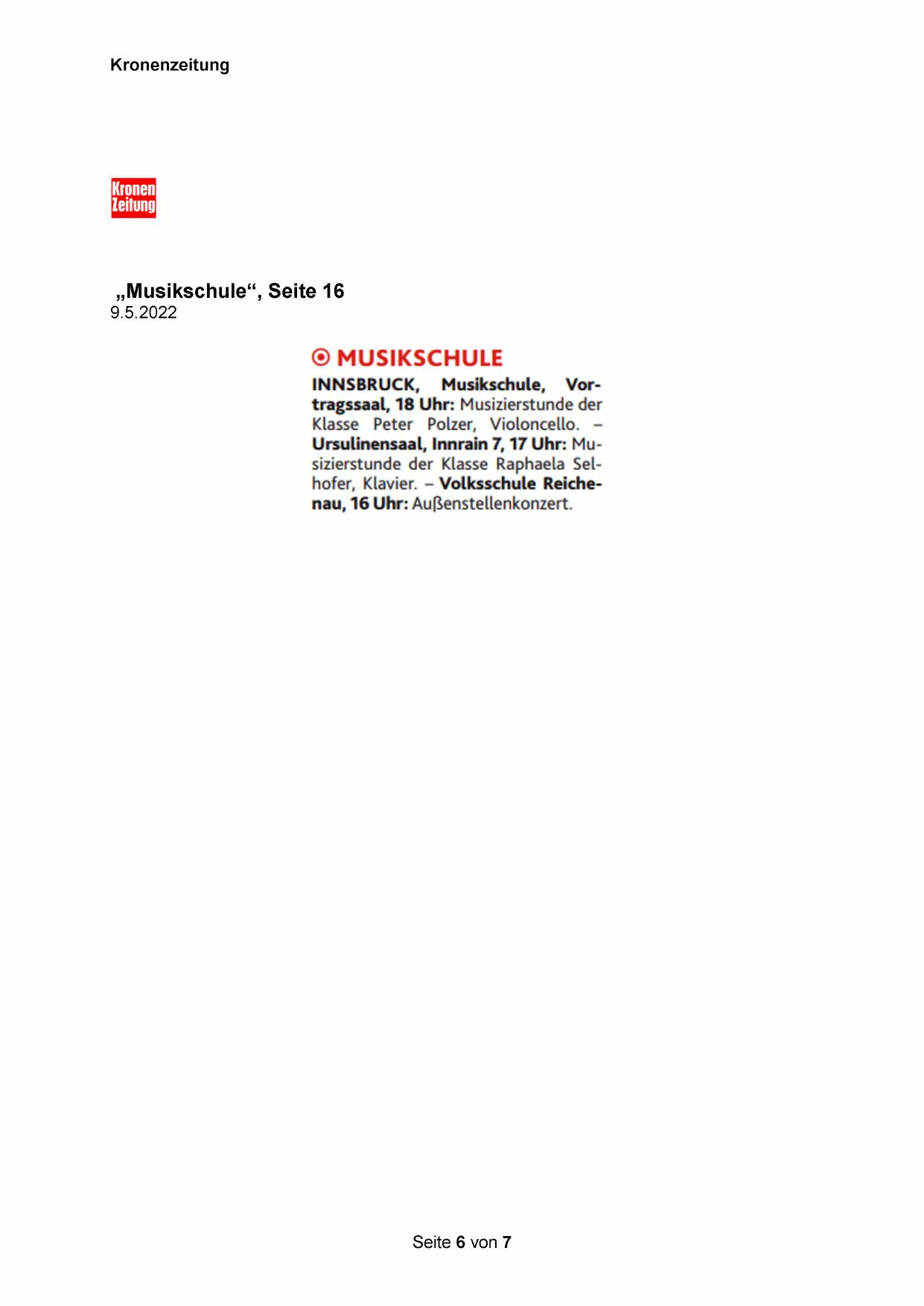 Ursulinensaal, Innrain 7, 17 Uhr: Musizierstunde der Klasse Raphaela Selhofer, Klavier. - Volksschule Reichenau, 16 Uhr: Außenstellenkonzert.