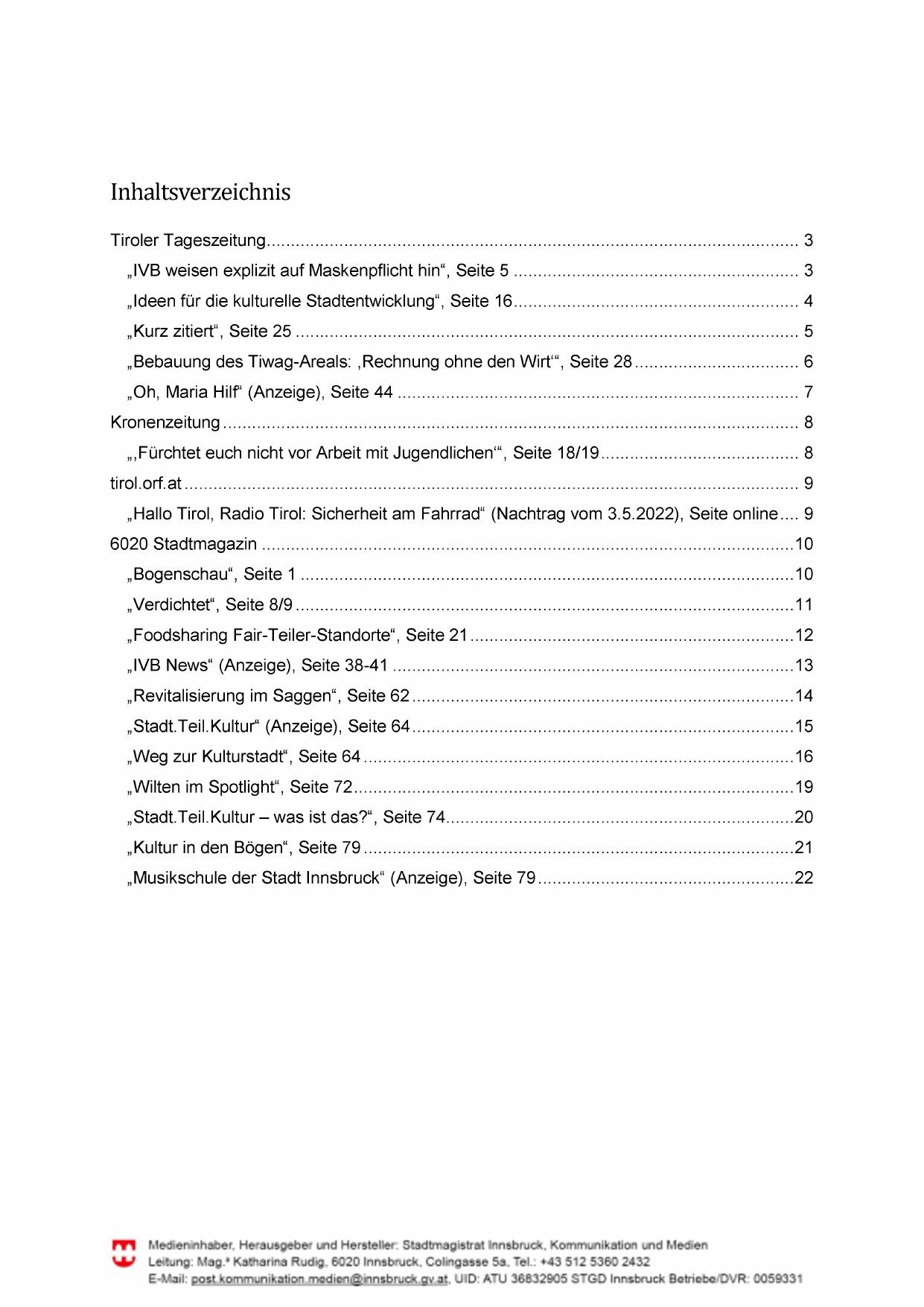 „Hallo Tirol, Radio Tirol: Sicherheit am Fahrrad“ (Nachtrag vom 3.5.2022), Seite online.... 9