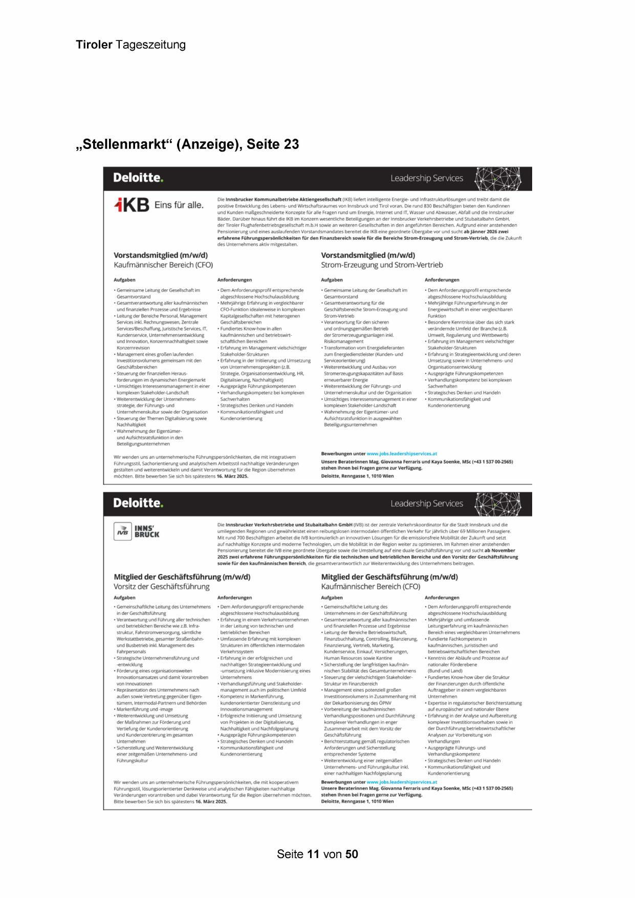 Pensionierung und eines auslaufenden Vorstandsmandates bereitet die IKB eine geordnete Übergabe vor und sucht ab Jänner 2026 zwei