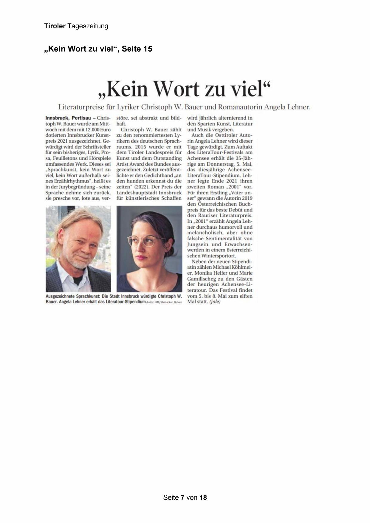 Innsbruck, Pertisau —- Christoph W. Bauer wurde am Mittwoch mit dem mit 12.000 Euro