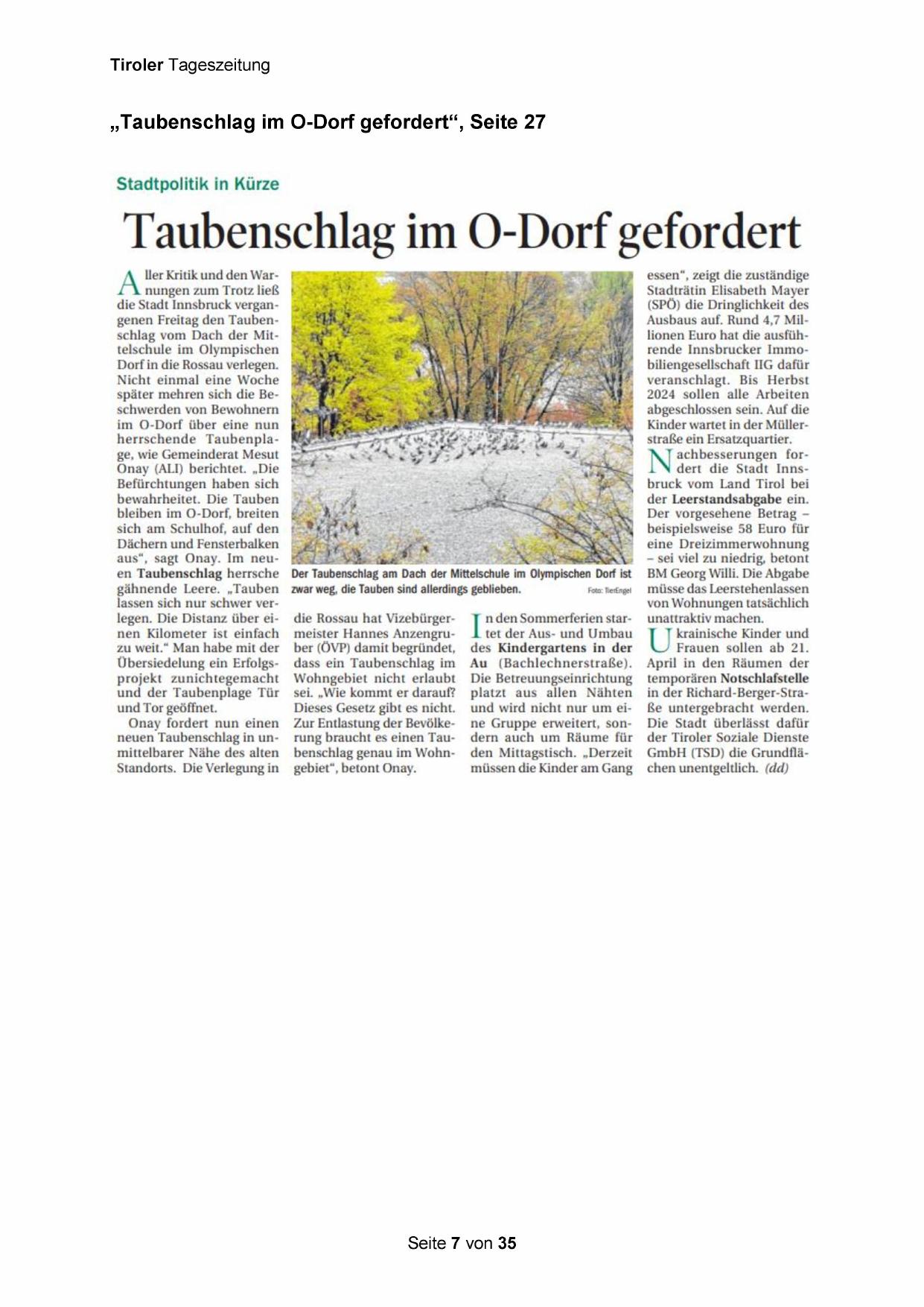 „Taubenschlag im O-Dorf gefordert“, Seite 27